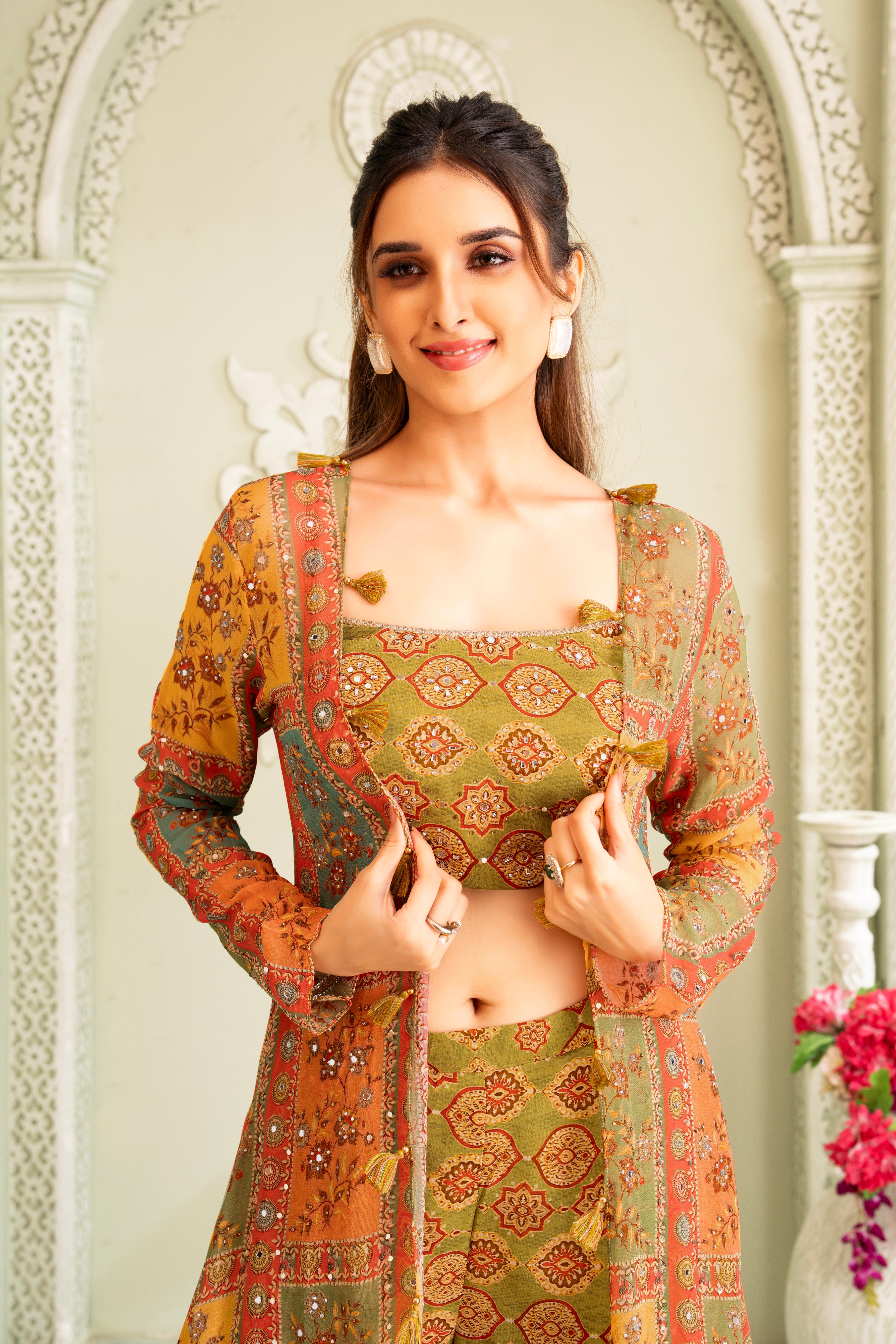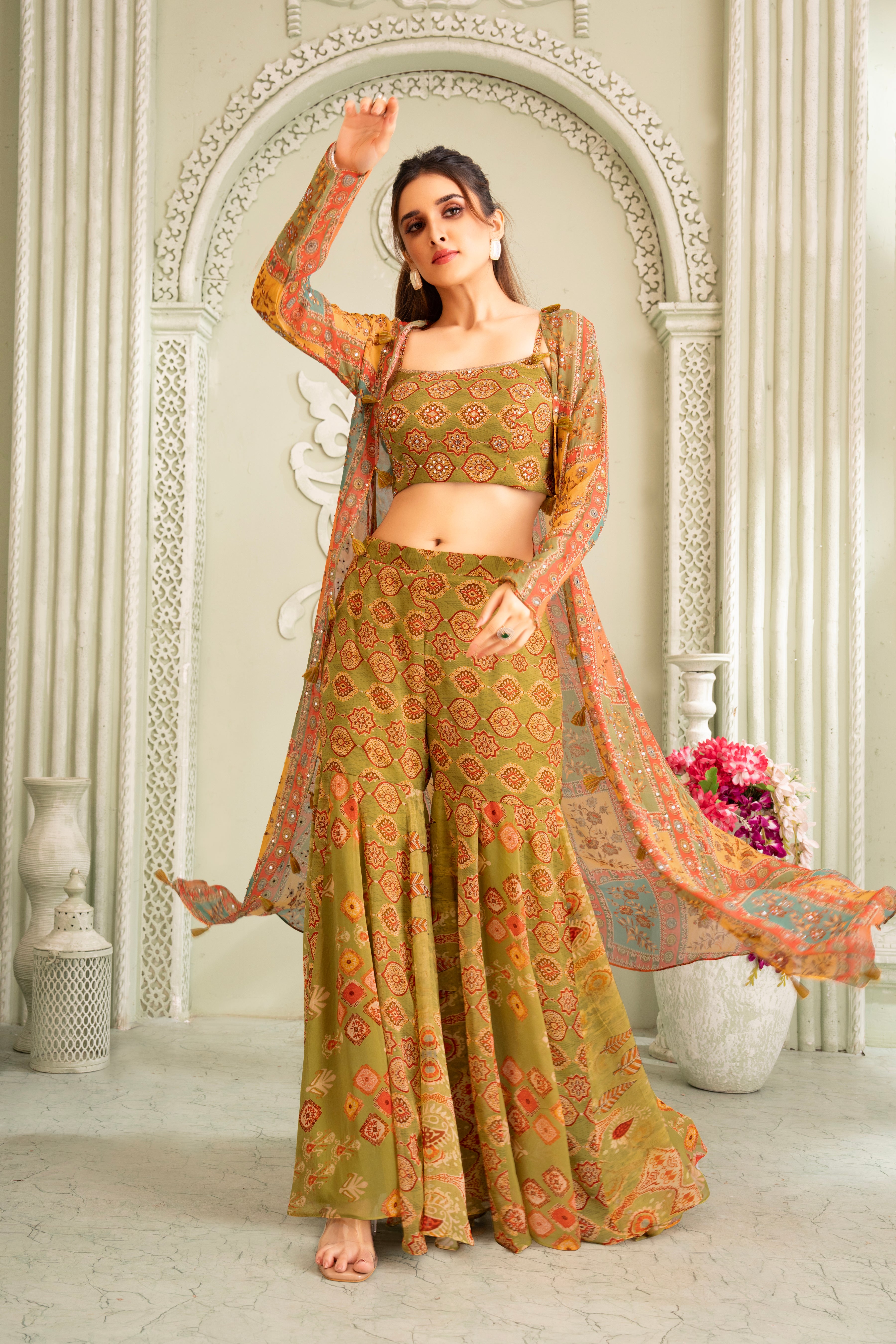 Elevate your festive style with this stunning three-piece gharara set, crafted in soft, flowy georgette fabric. The set features a square-neck crop top paired with flared gharara pants adorned with vibrant traditional prints, exuding a perfect blend of ethnic charm and modern silhouette. The look is completed with a lightweight, sheer printed jacket that adds a graceful layer of elegance and movement.