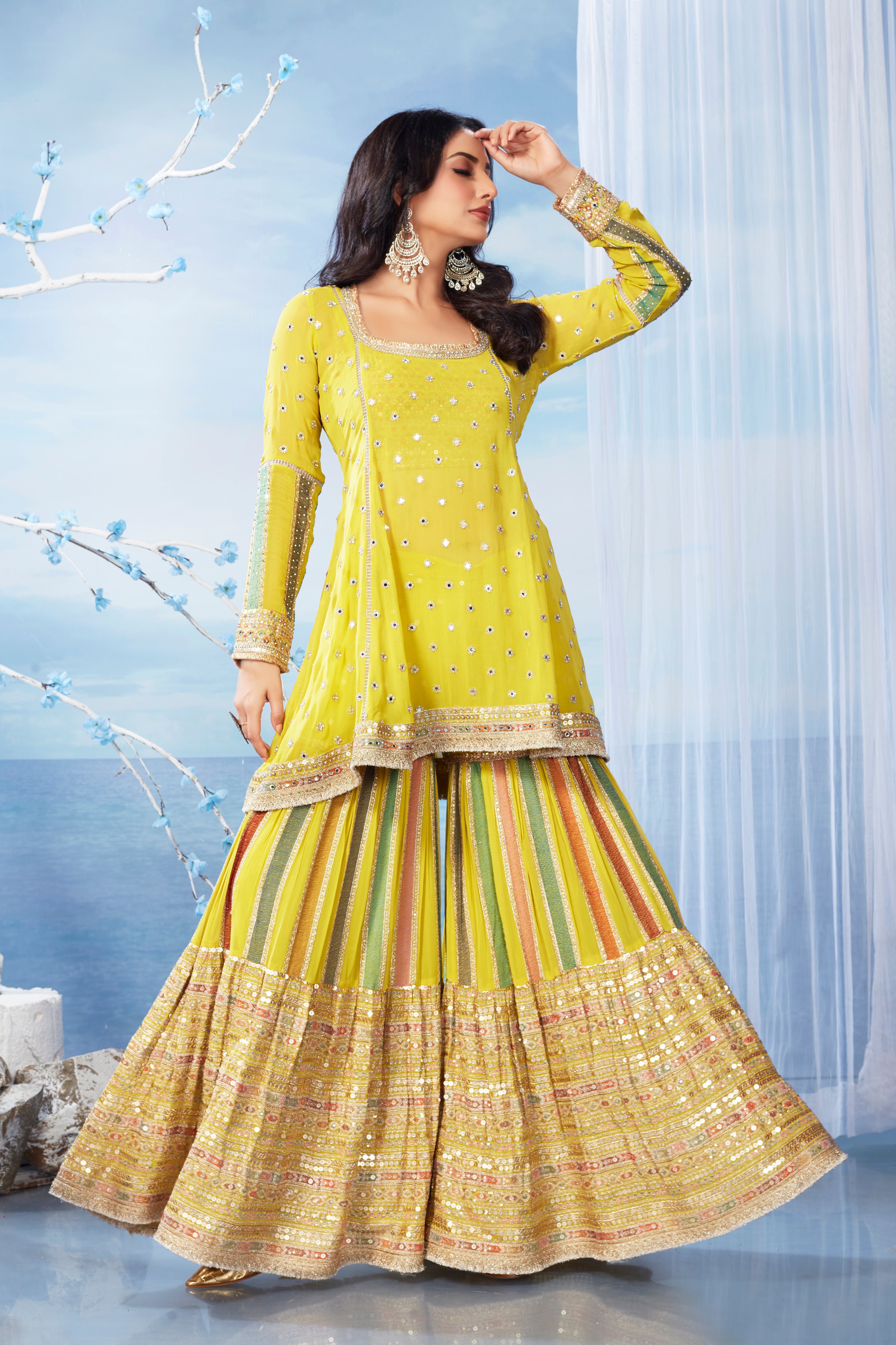 This stunning ensemble features a hand-embroidered sheer kurta layered over an embroidered bustier, complemented by exquisitely designed gharara pants. A finely crafted dupatta completes the set, adding an elegant and lavish touch.