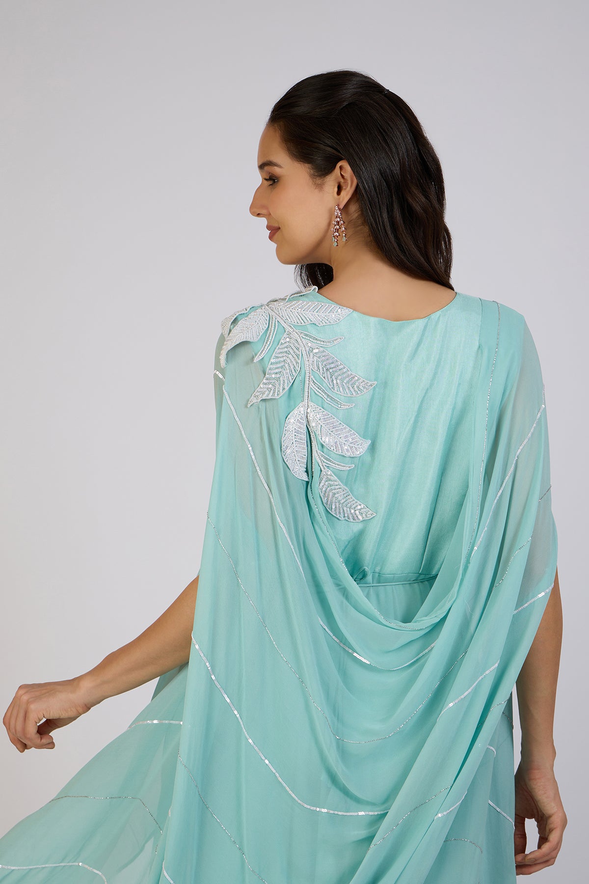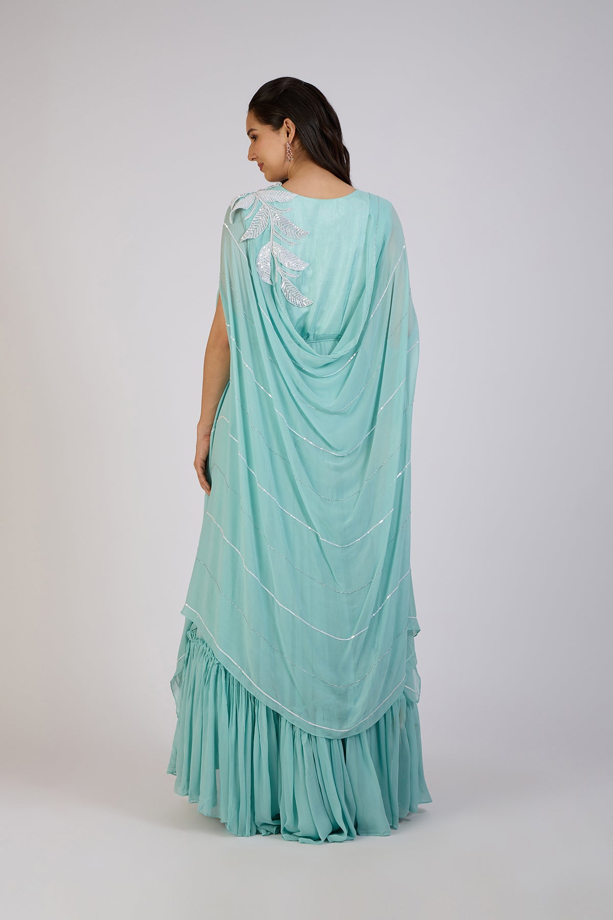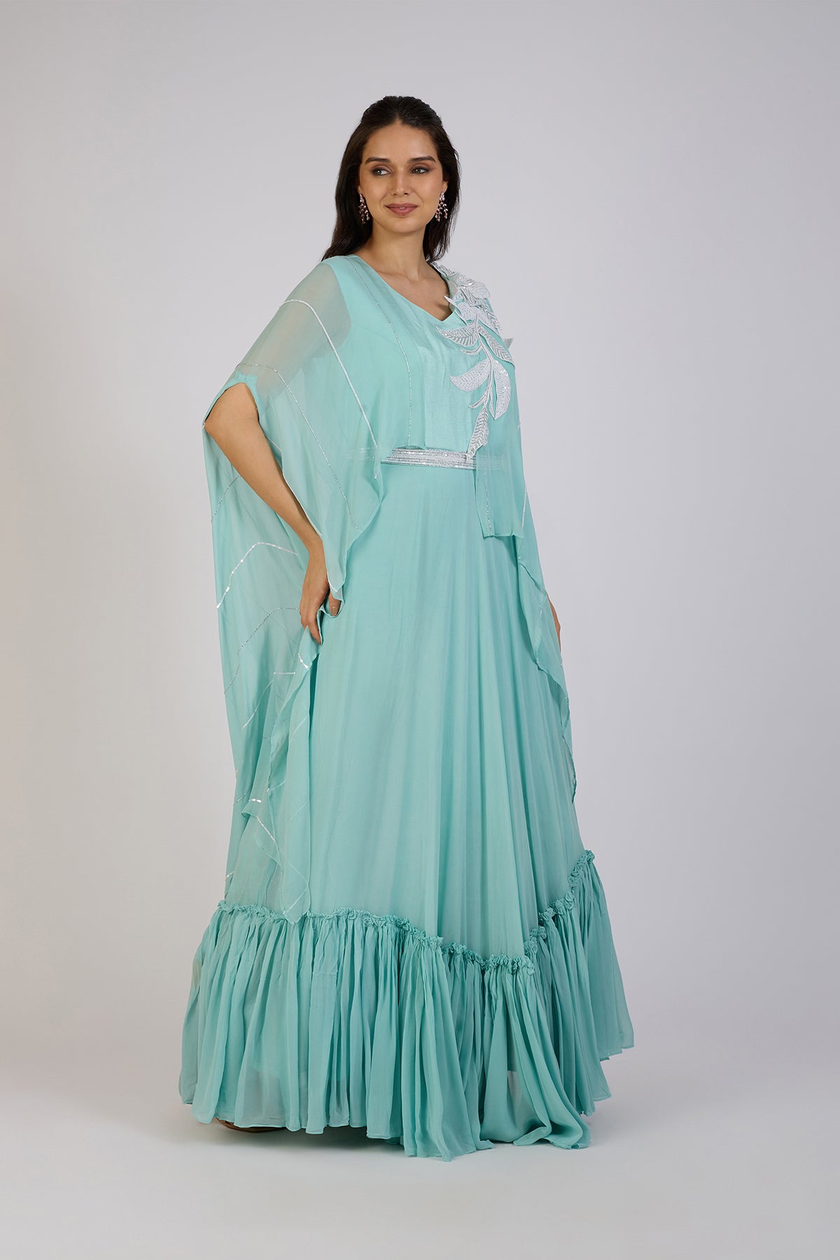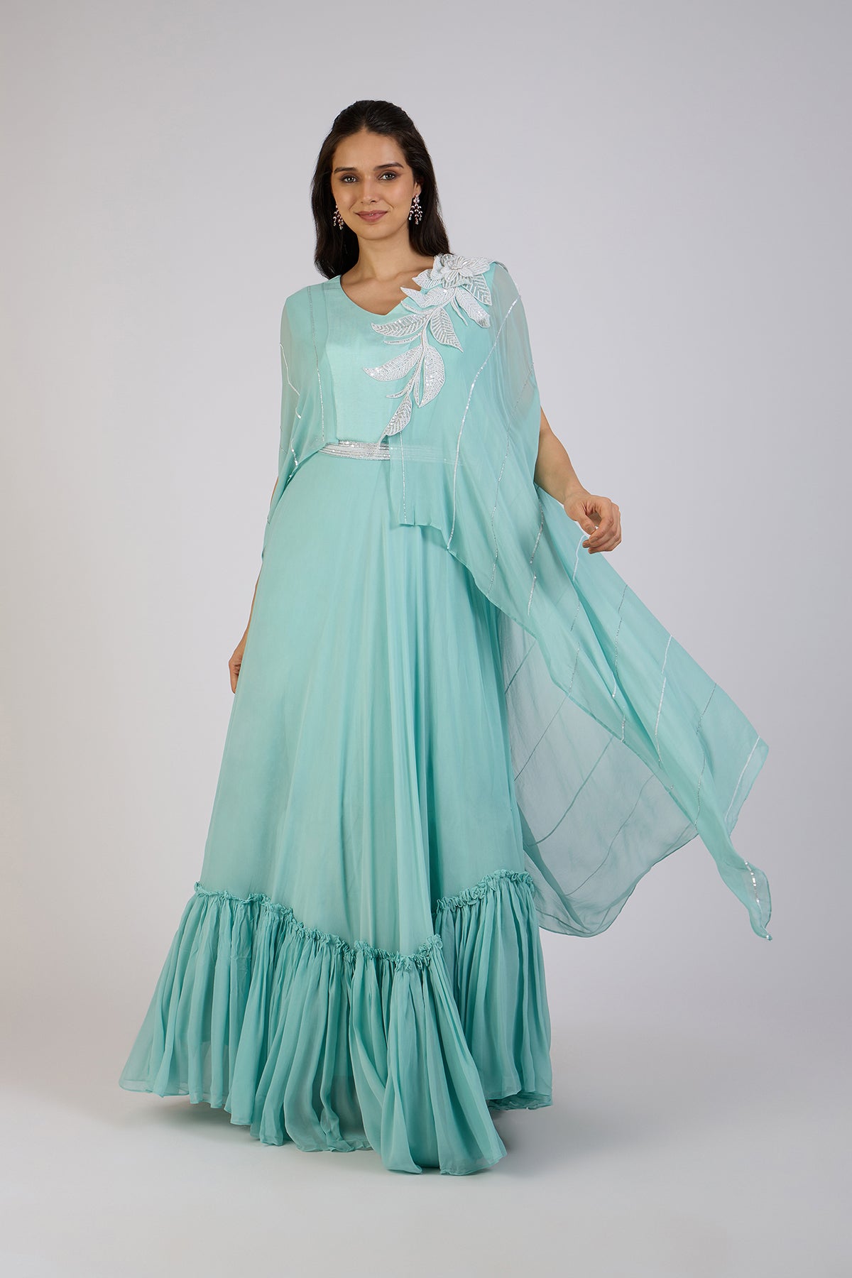 Grace meets modern elegance in this aqua blue cape-style Anarkali. Featuring a flowing silhouette with delicate silver embellishments and a shimmering leaf motif on the shoulder, this ensemble exudes sophistication. The layered cape drapes effortlessly, adding movement and charm, while the ruffled hemline lends a playful yet refined touch.Perfect for festive gatherings, receptions, or any special occasion where you want to make a graceful statement.