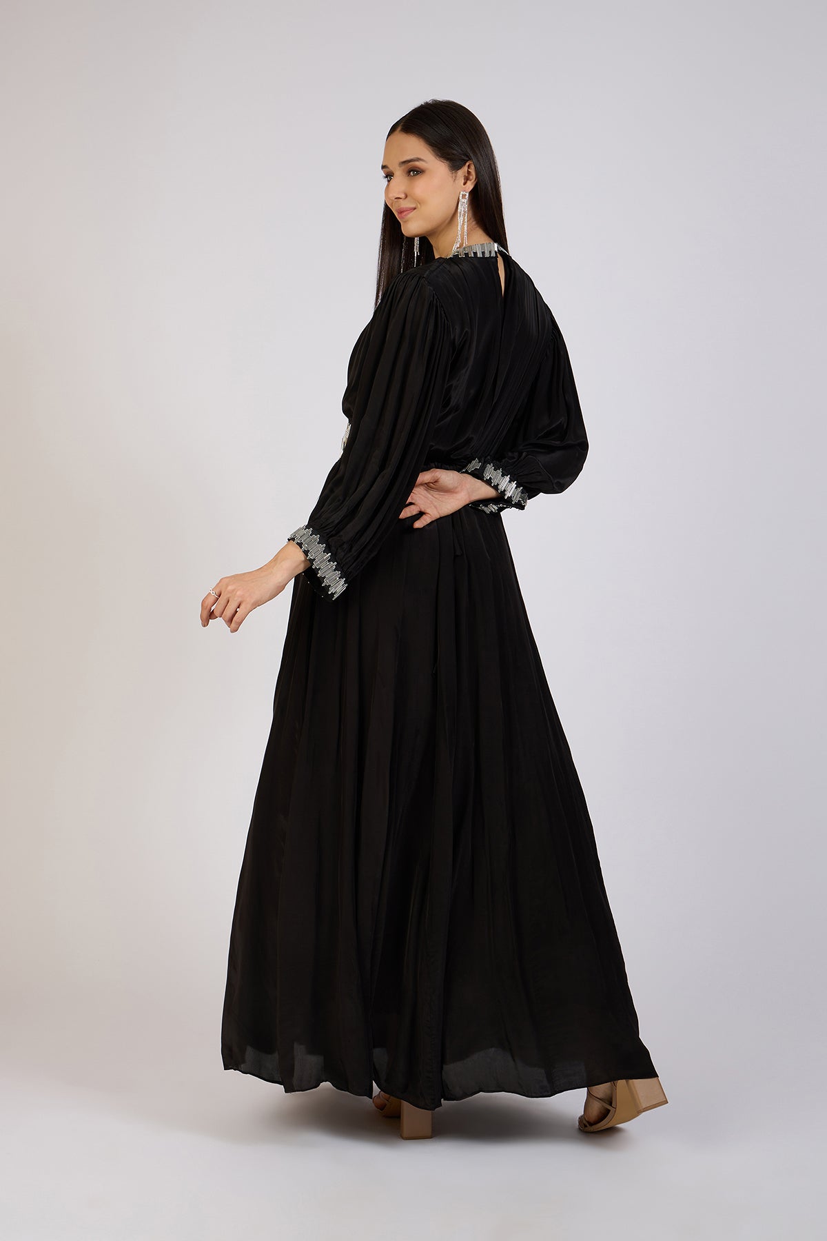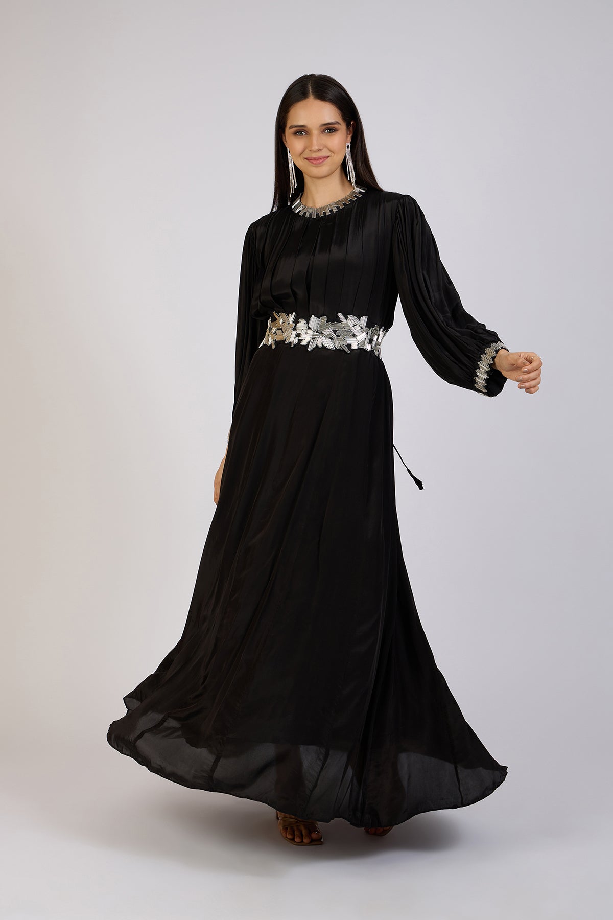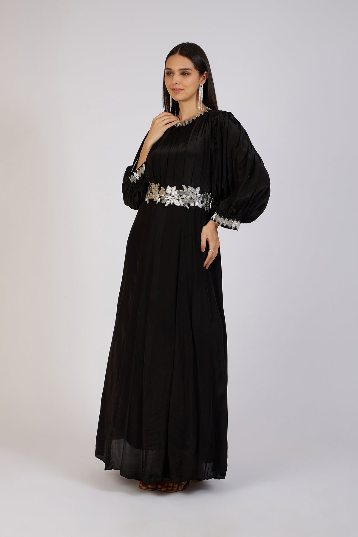 Make a bold statement in this rich black gown. Designed with delicate pleating, full sleeves, and a graceful silhouette, the ensemble is elevated by intricate silver embellishments on the neckline, cuffs, and waist.