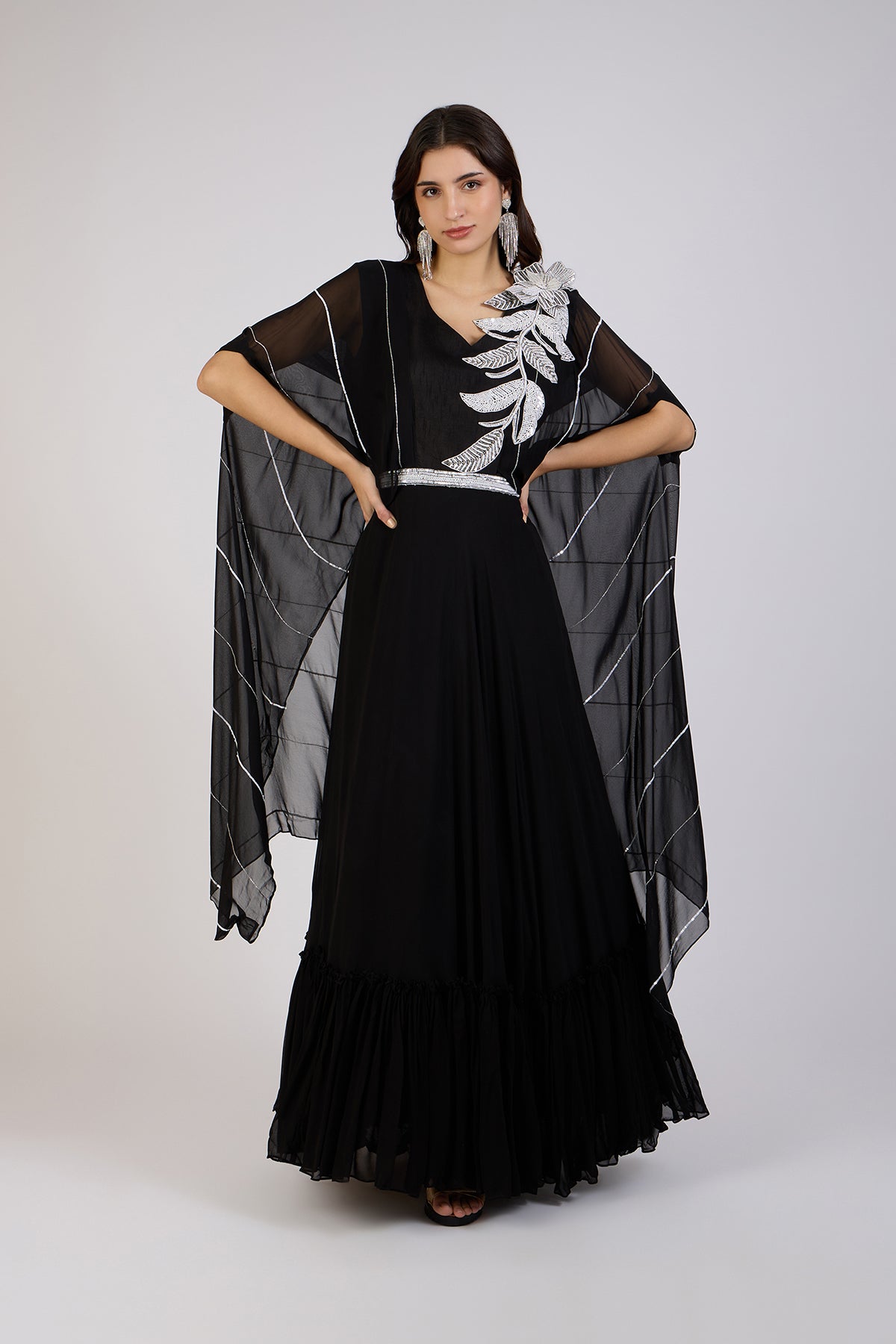 The flowing silhouette features a cascading cape with delicate silver thread detailing, adding a touch of shimmer. An intricately embroidered silver floral motif on the shoulder enhances the elegance, while the ruffled hemline adds playful movement. Perfect for festive occasions, this ensemble blends contemporary style with timeless charm.