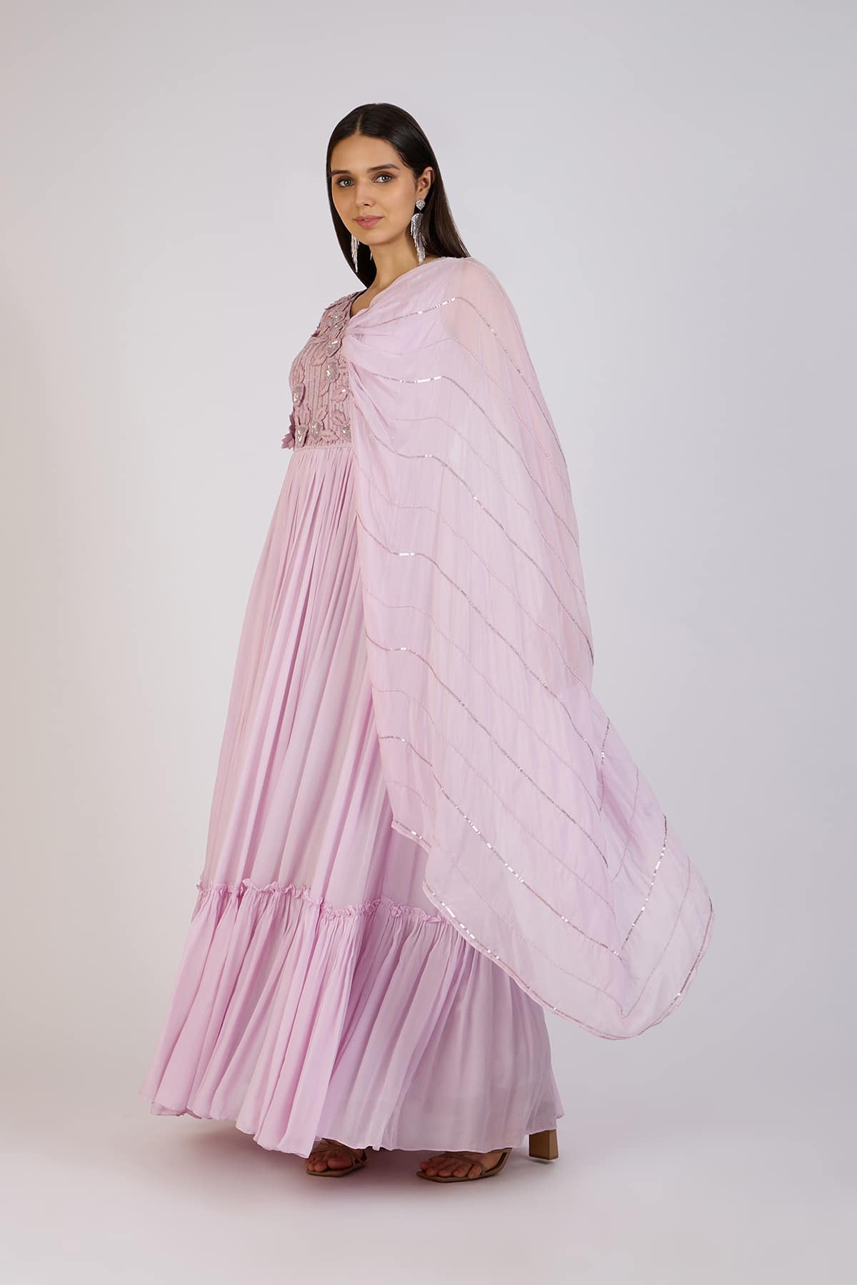 This stunning blush pink gown set is crafted to captivate. The bodice boasts delicate embroidery with intricate sequin and thread detailing, lending a refined sparkle. It flows into a full, pleated skirt finished with a ruffled hem, creating an elegant silhouette ideal for graceful movement. Complemented by a sheer dupatta embellished with subtle sequin accents, this ensemble radiates timeless elegance and sophistication.