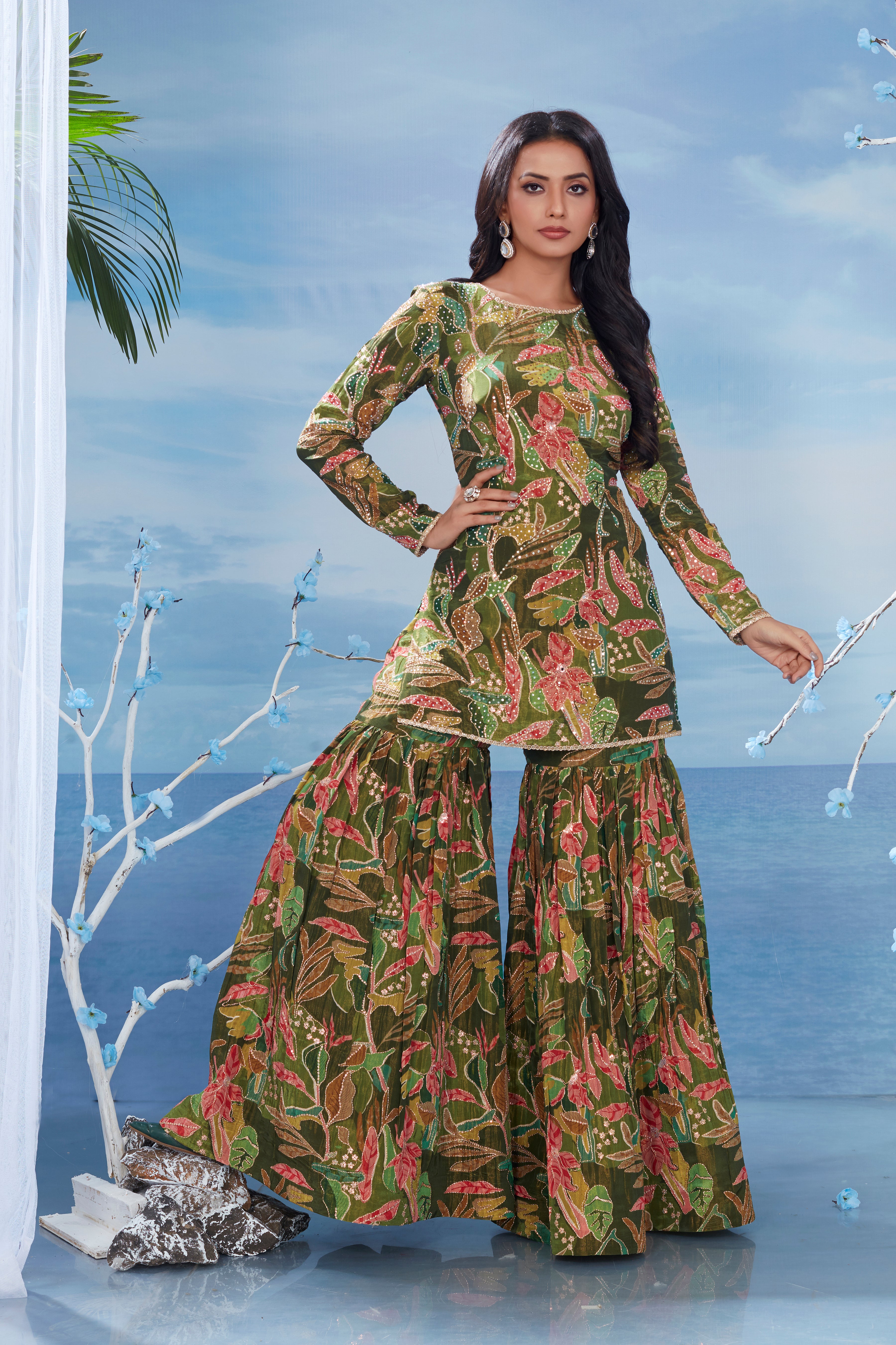 Enhance your wardrobe with this printed full-sleeve kurta and gharara set, exquisitely detailed with delicate embroidery. The intricate craftsmanship and lace accents beautifully complement the vibrant prints, offering a sophisticated appeal. Finished with elegant lace borders, this ensemble is ideal for semi-formal events that demand refined elegance and understated luxury, and it includes a matching dupatta for a complete look.