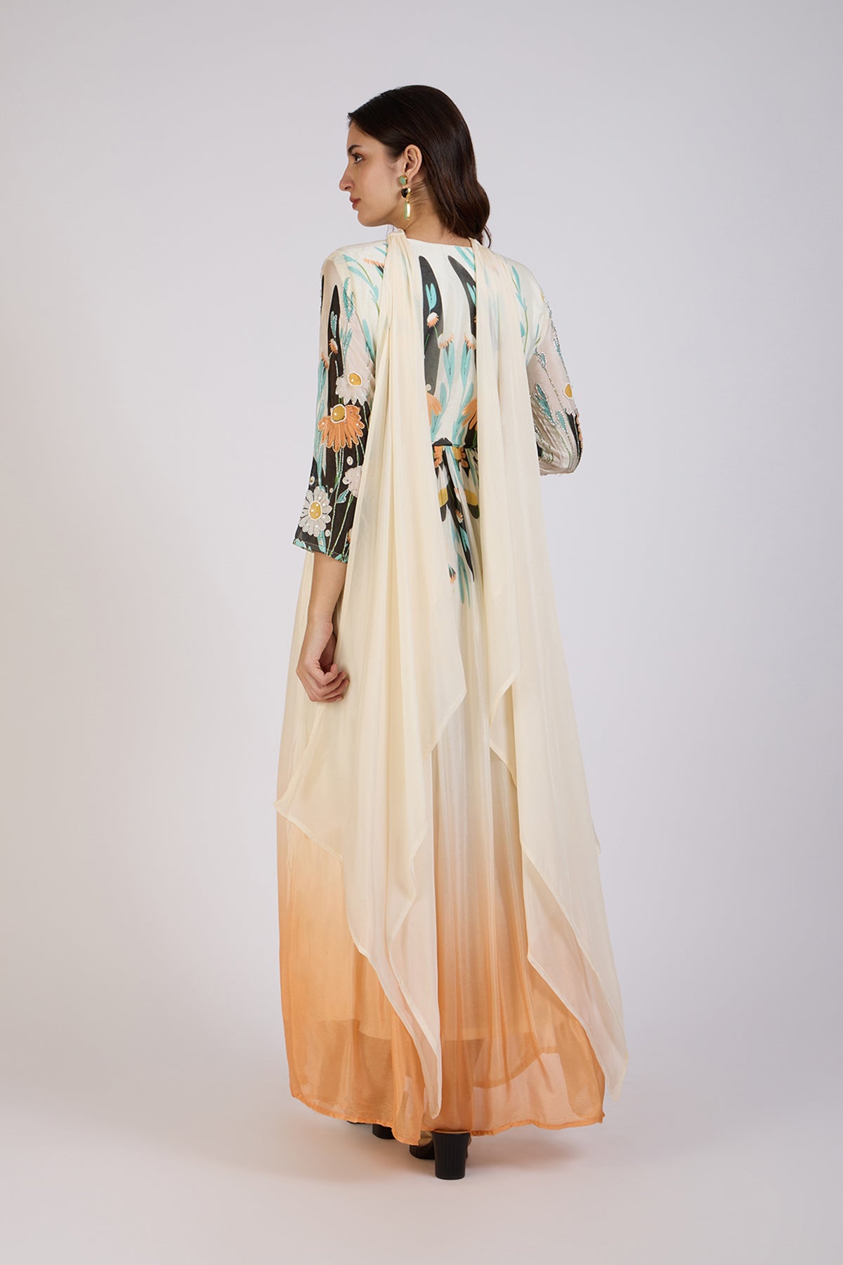 This enchanting maxi dress blends artistry with comfort, featuring a beautifully detailed floral bodice that adds a vibrant touch. The ombre effect gracefully transitions from soft ivory to warm peach, creating a flowing, dreamy aesthetic. Designed with sheer, airy sleeves and an attached drape, this piece offers effortless movement and a flattering silhouette. Whether worn for festive occasions or elegant gatherings, this dress is a perfect fusion of contemporary charm and traditional allure.