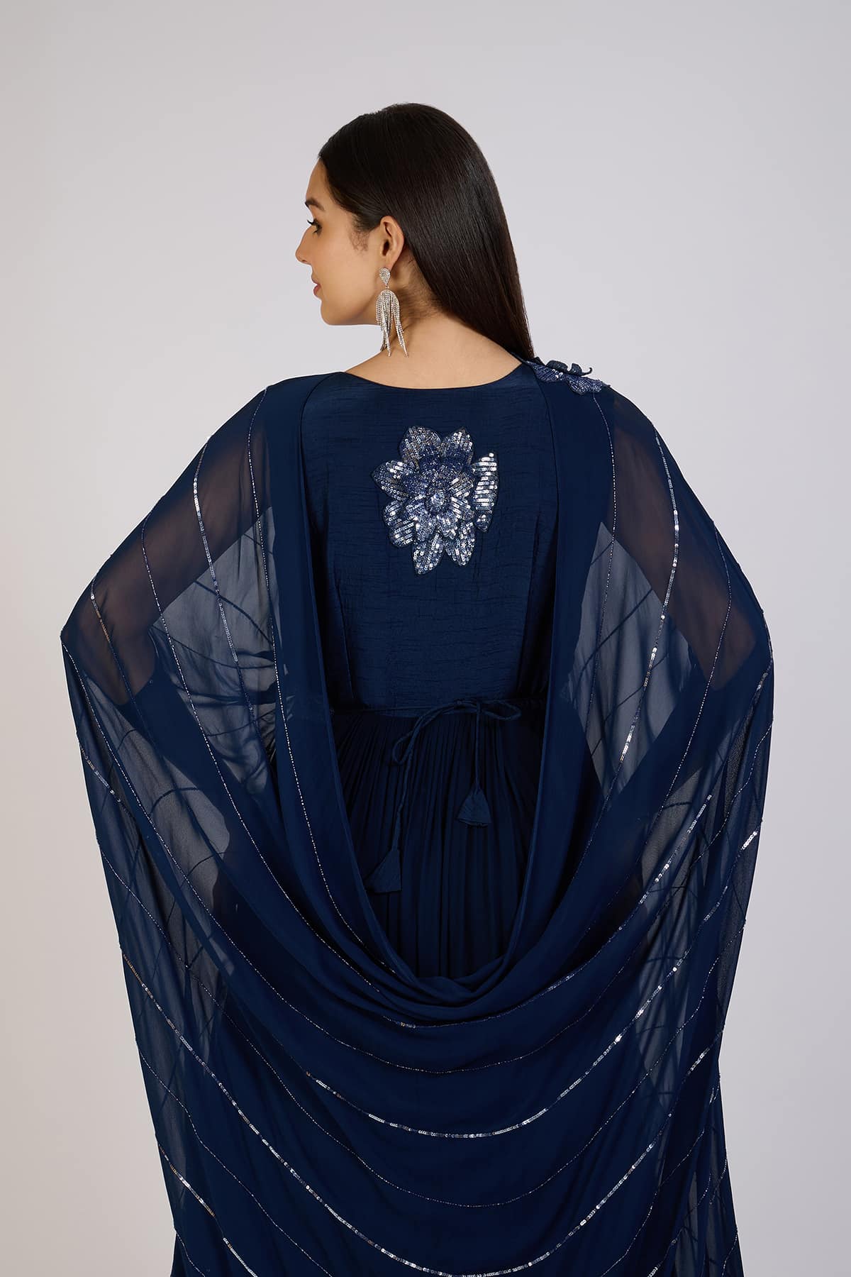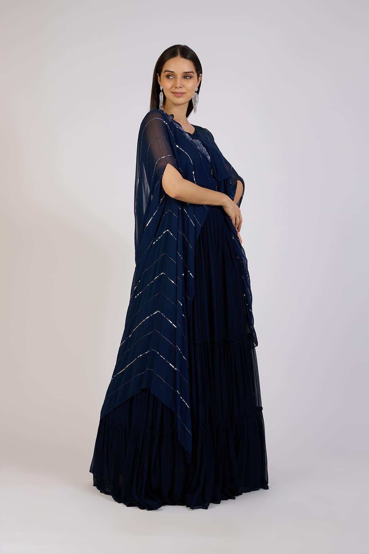 This stunning navy blue draped gown exudes a timeless charm, crafted in a flowy silhouette that gracefully enhances every movement. The shimmering diagonal sequin embellishments add a subtle sparkle, creating a captivating interplay of light. The sheer draped cape overlay lends a regal touch, blending modern design with traditional aesthetics. The gown features a fitted bodice with delicate embroidery along the shoulder, while the pleated skirt flows effortlessly to the floor