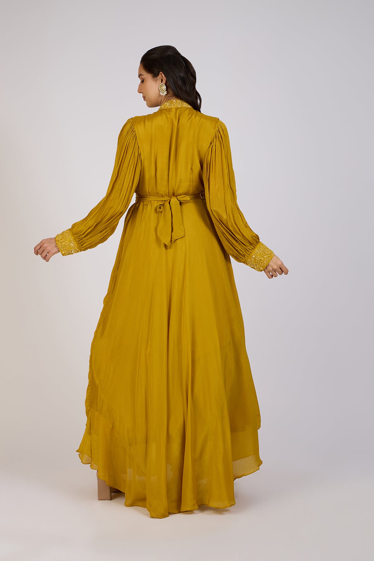 This mustard-gold ensemble exudes timeless grace with its rich, flowing silhouette and intricate embroidery. The high-collared bodice is adorned with delicate handwork, adding a regal charm, while the billowing sleeves and layered drapes create a sense of fluid movement. The cinched waistline enhances the structure, making it a perfect blend of sophistication and comfort.