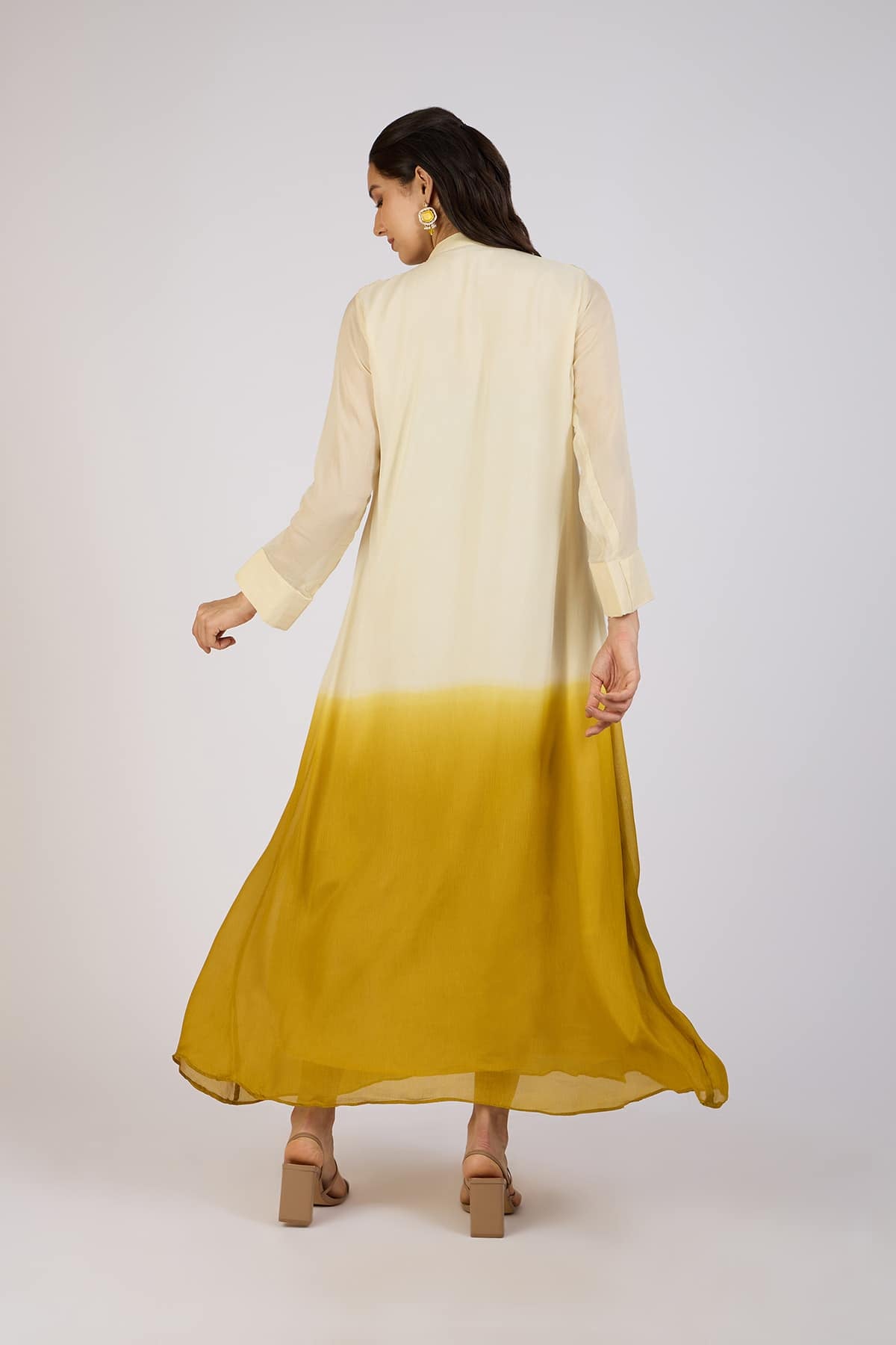 Embrace effortless elegance with this ombre kurta, blending soft cream into a rich mustard hue. Delicate floral embroidery in contrasting tones adorns the bodice, adding a touch of refined charm. The mandarin collar and buttoned placket offer a modern silhouette, while the flowing fabric ensures graceful movement. Perfect for daytime festivities or casual gatherings.