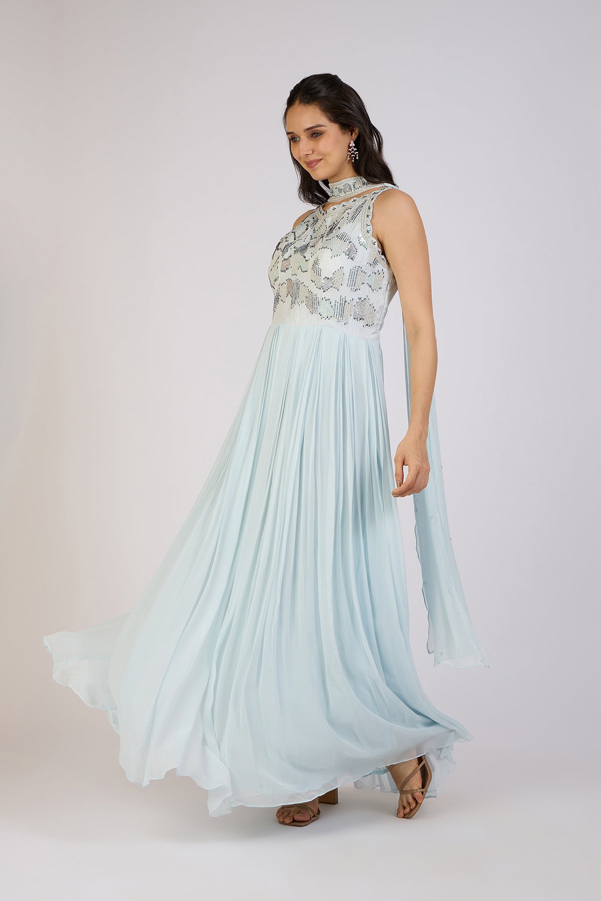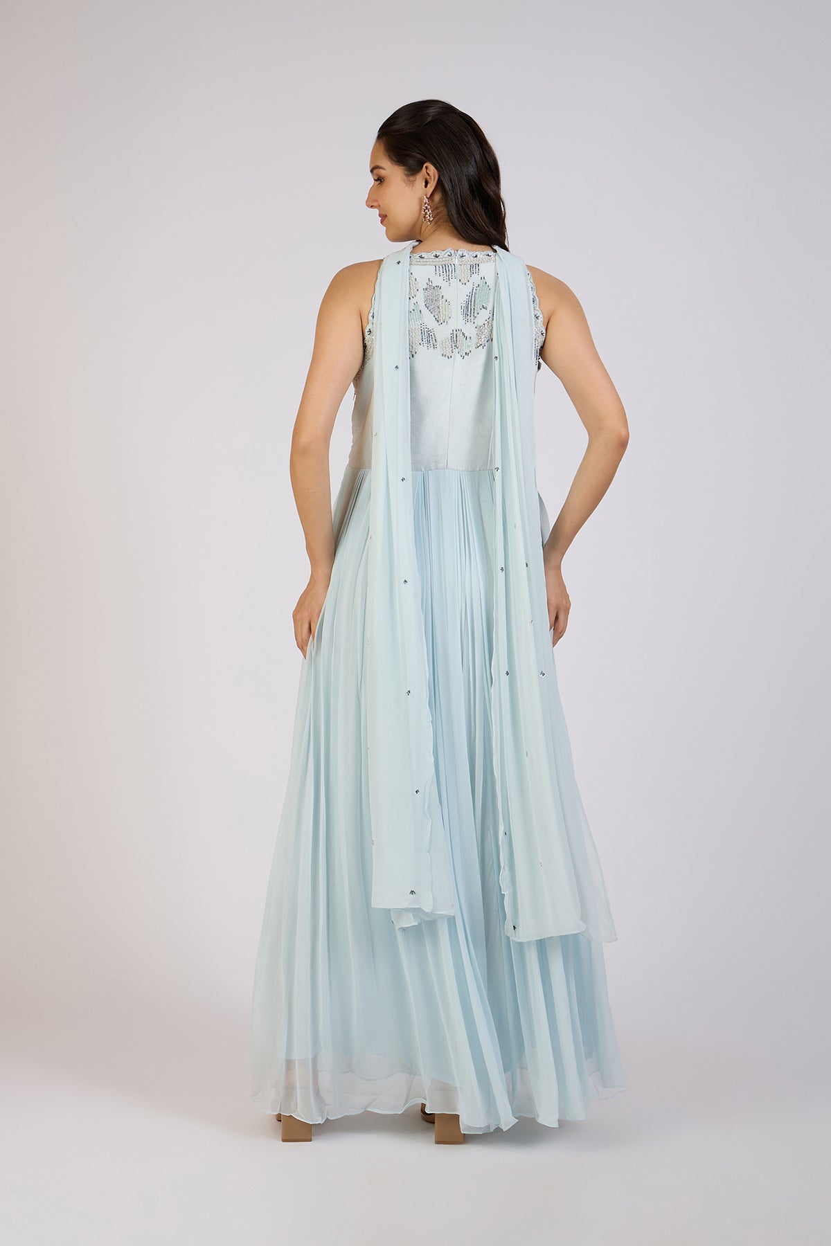 Step into a world of grace with this icy blue gown. The intricately hand-embroidered bodice shimmers with sequin detailing, adding a touch of glamor. The flowing georgette skirt drapes beautifully, offering a soft, ethereal silhouette. A delicate neck drape completes the look, making it a perfect choice for evening soirées, receptions, or any special occasion where elegance is key.
