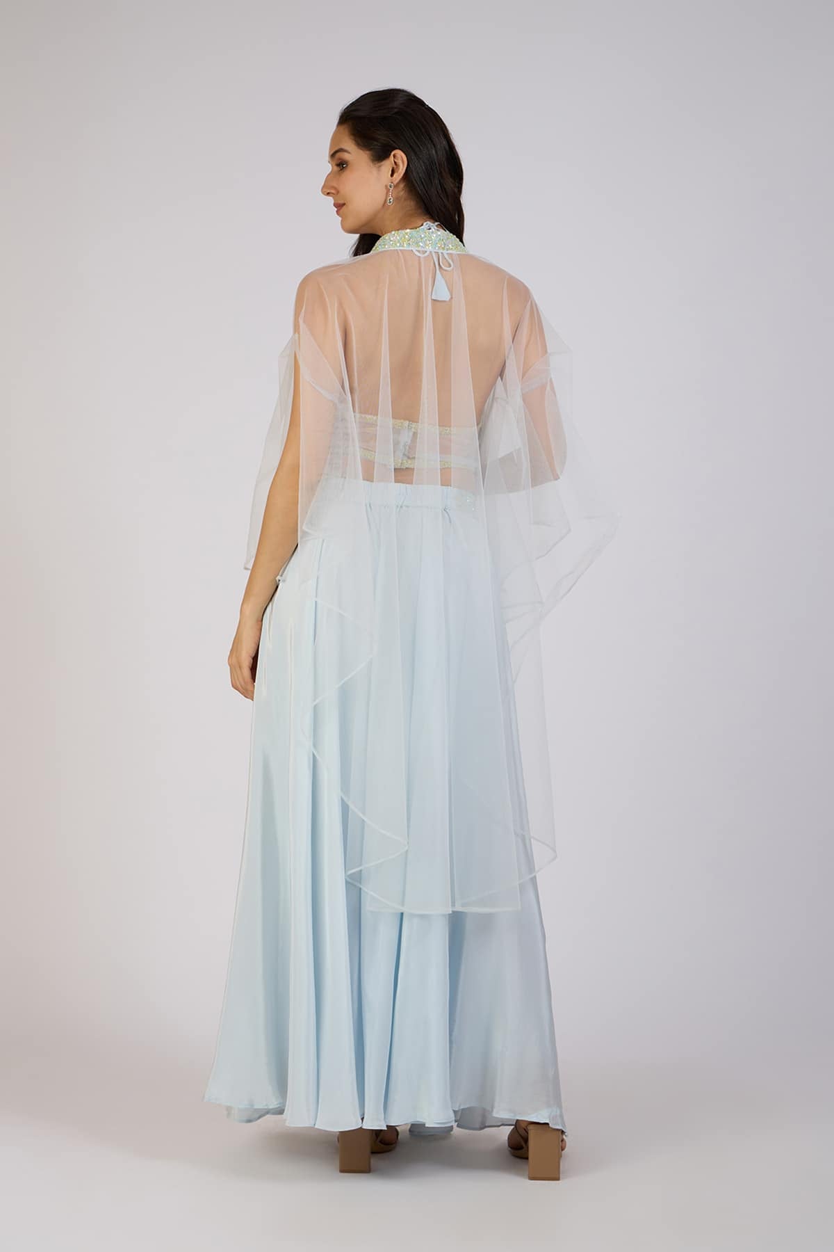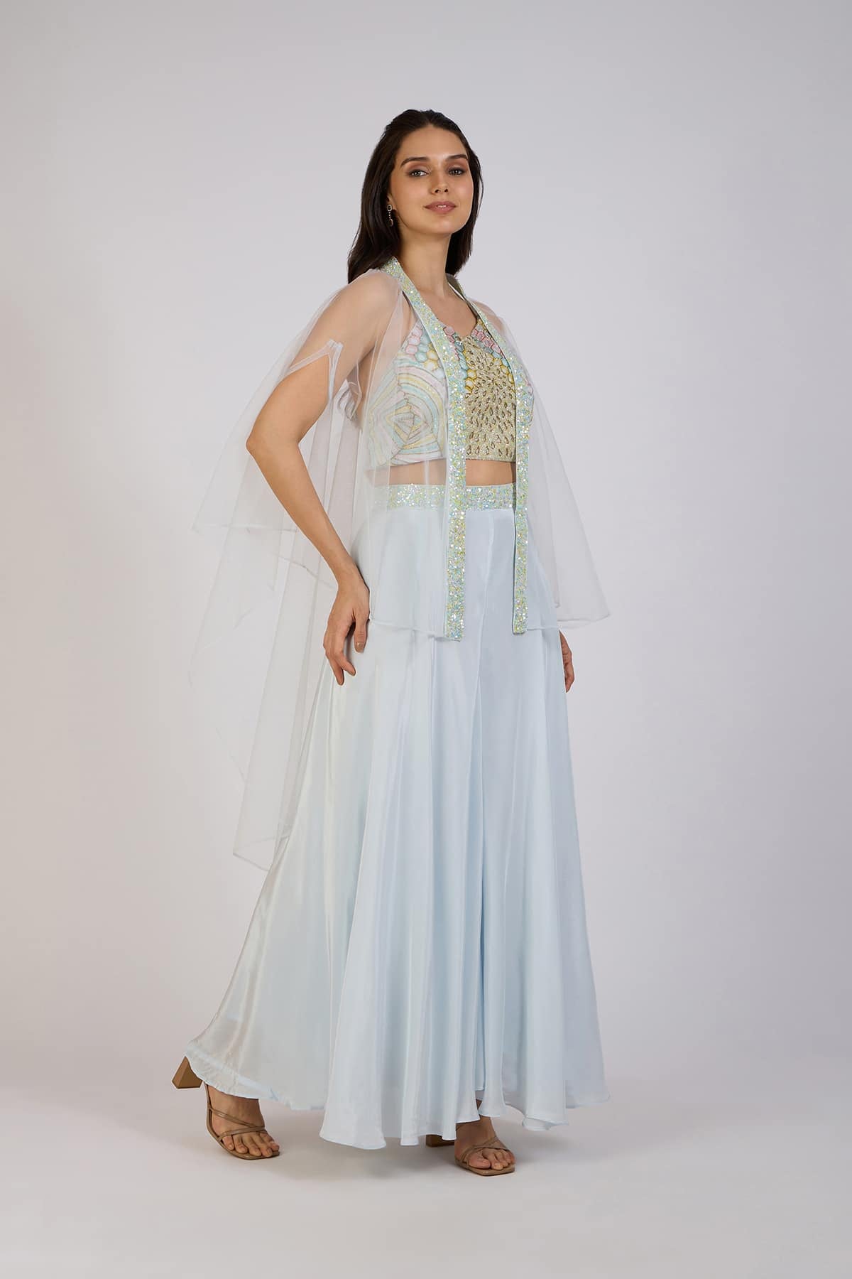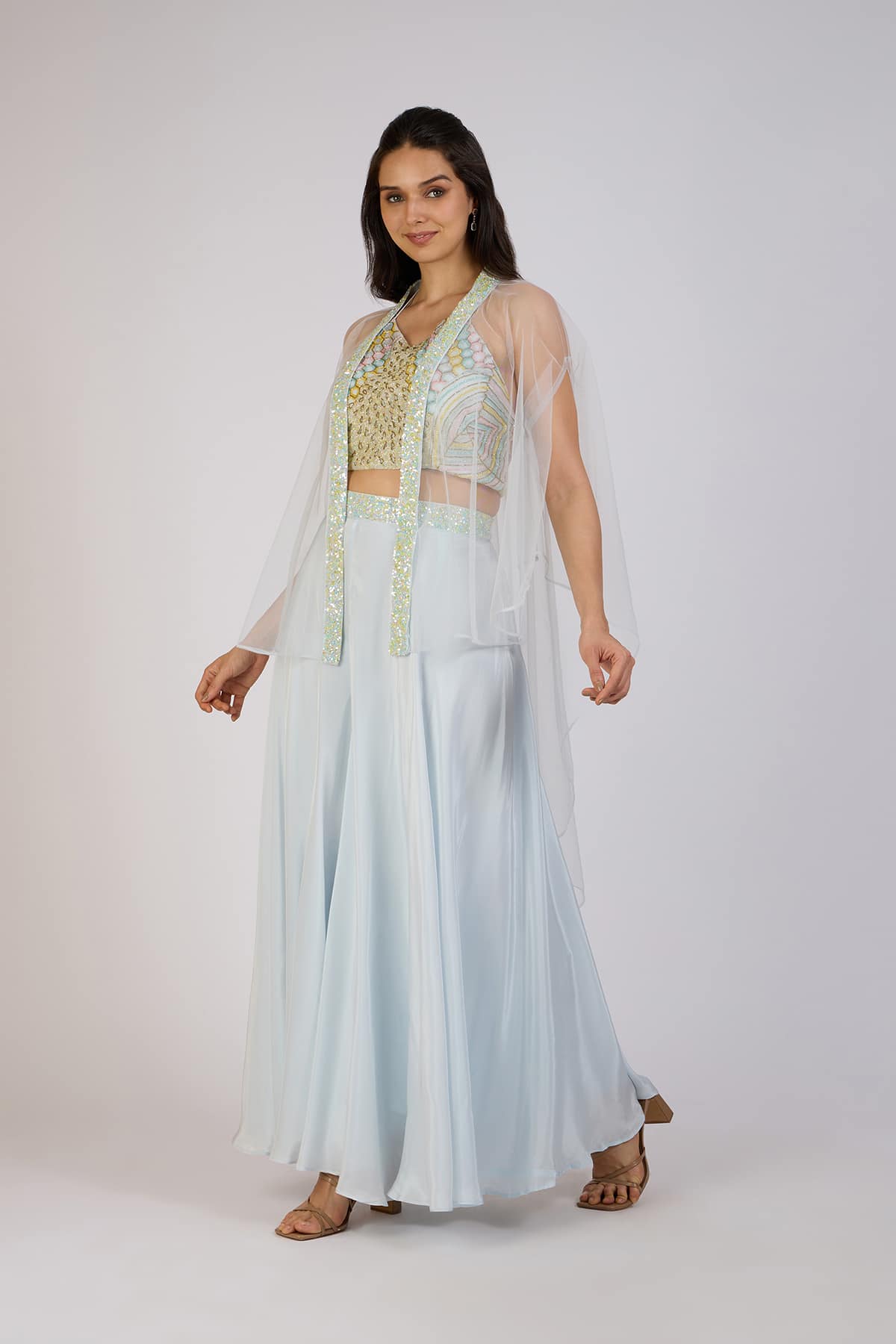 Elevate your style with this stunning three-piece set, featuring a sequin-embroidered crop top, a flowing ice blue skirt, and a sheer cape with shimmering detailing. The delicate embellishments and soft pastel tones create a perfect blend of elegance and modern charm.
