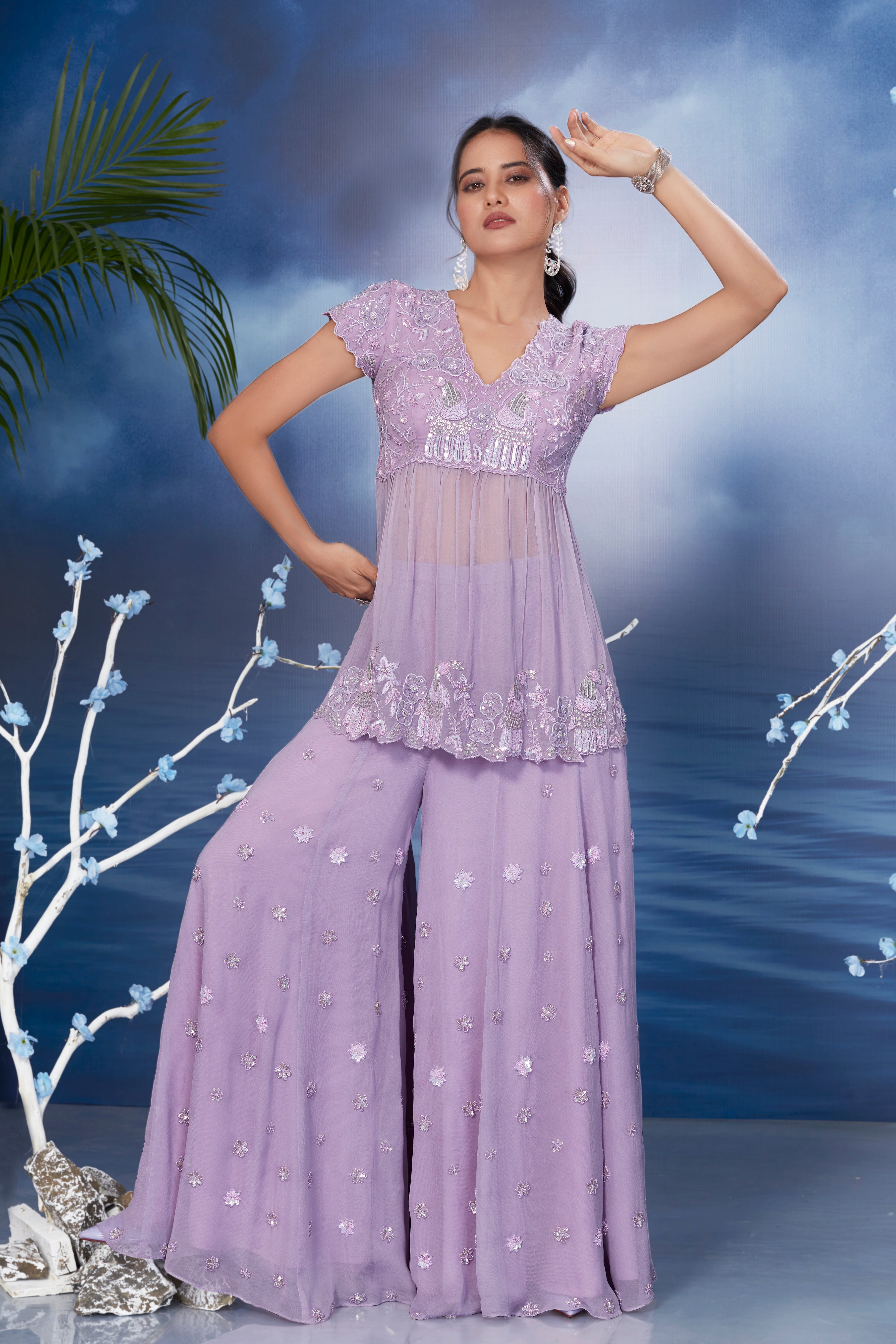 This lilac cap-sleeve peplum top is adorned with exquisite hand-embellished pearls, sequins, and cutdana arranged in a graceful floral pattern. It pairs seamlessly with a concept sharara crafted from premium georgette fabric, detailed with delicate floral hand embroidery to elevate its sophisticated silhouette. The look is completed with a flowing dupatta, adding an extra touch of refined elegance.