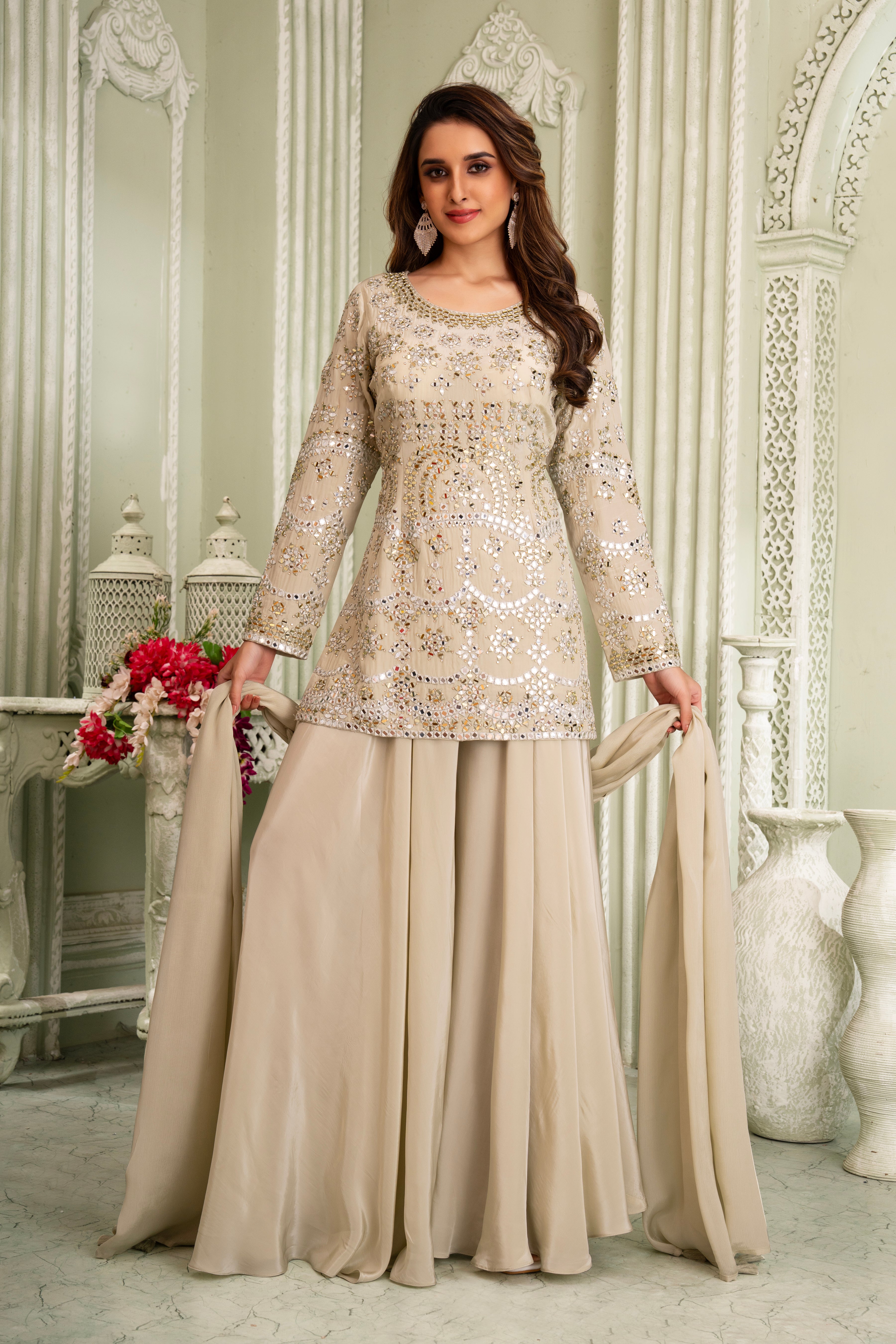 This ensemble features exquisite hand-embroidered mirror accents paired with resham embroidery, crafted into an elegant floral design. The perfectly tailored sharara, made of delicate crepe chinon fabric, creates a refined and graceful silhouette. A beautifully draped dupatta completes the look, radiating timeless sophistication and understated allure.