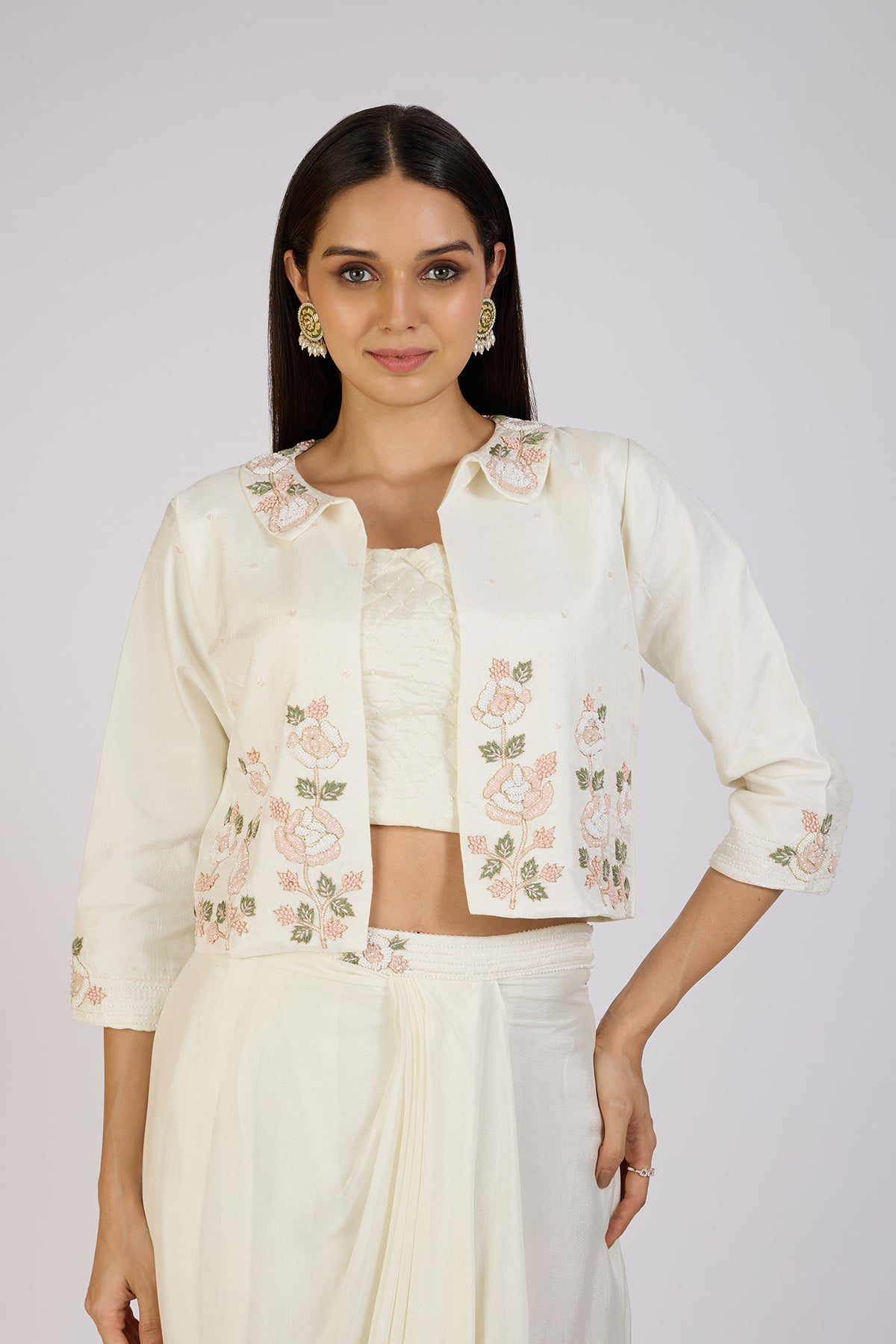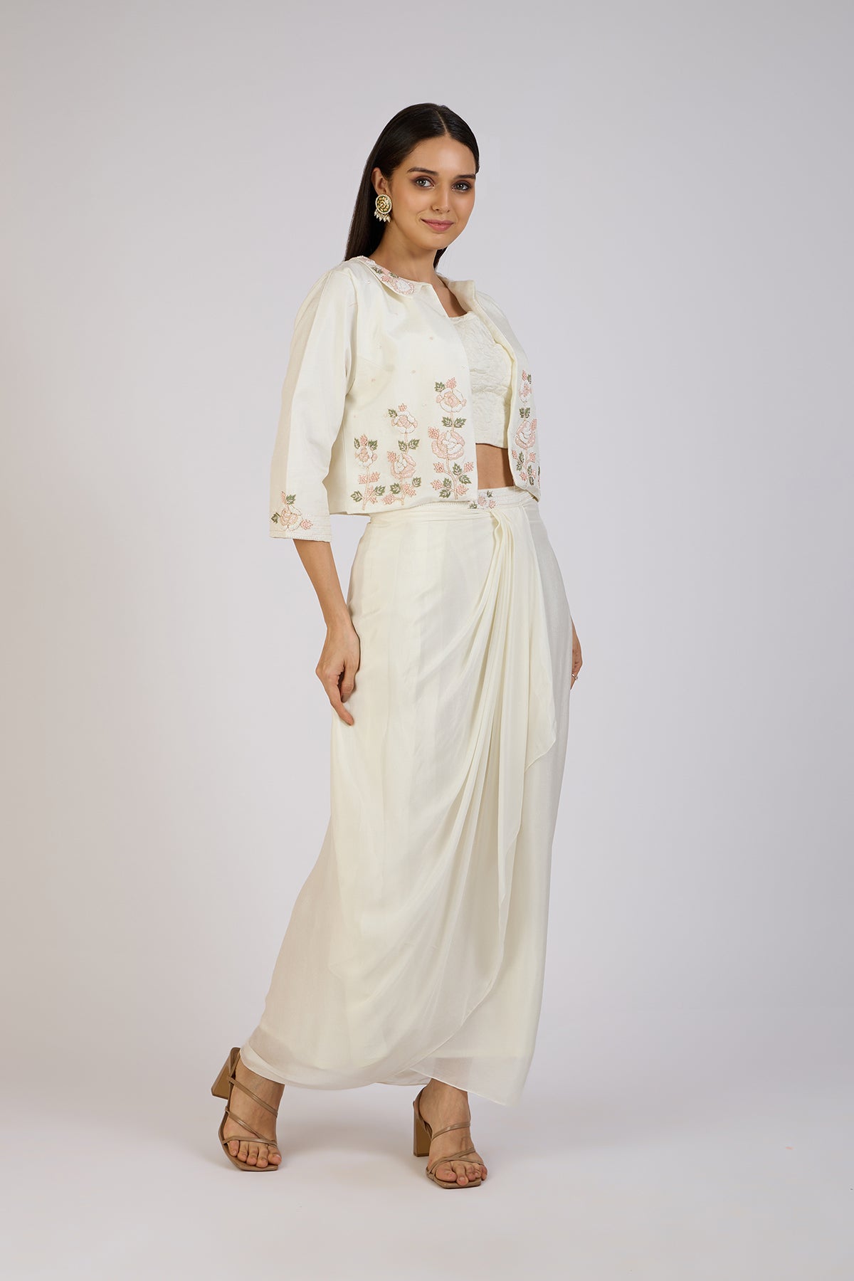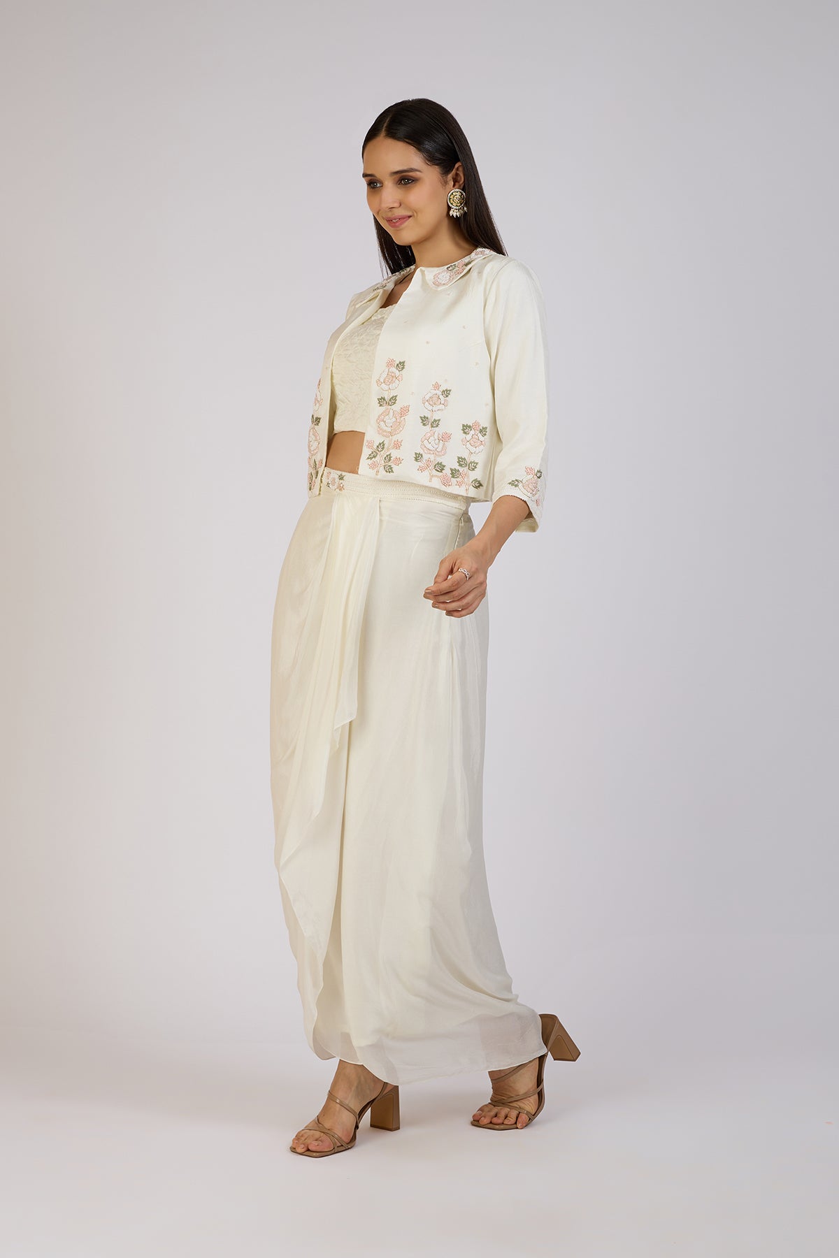 Embrace modern elegance with this ivory draped skirt set. Featuring a delicately pleated draped skirt paired with a textured blouse, the look is completed by a cropped jacket adorned with intricate floral embroidery. Perfect for festive gatherings, daytime celebrations, or special occasions.This set is a combination of classic charm and contemporary style.