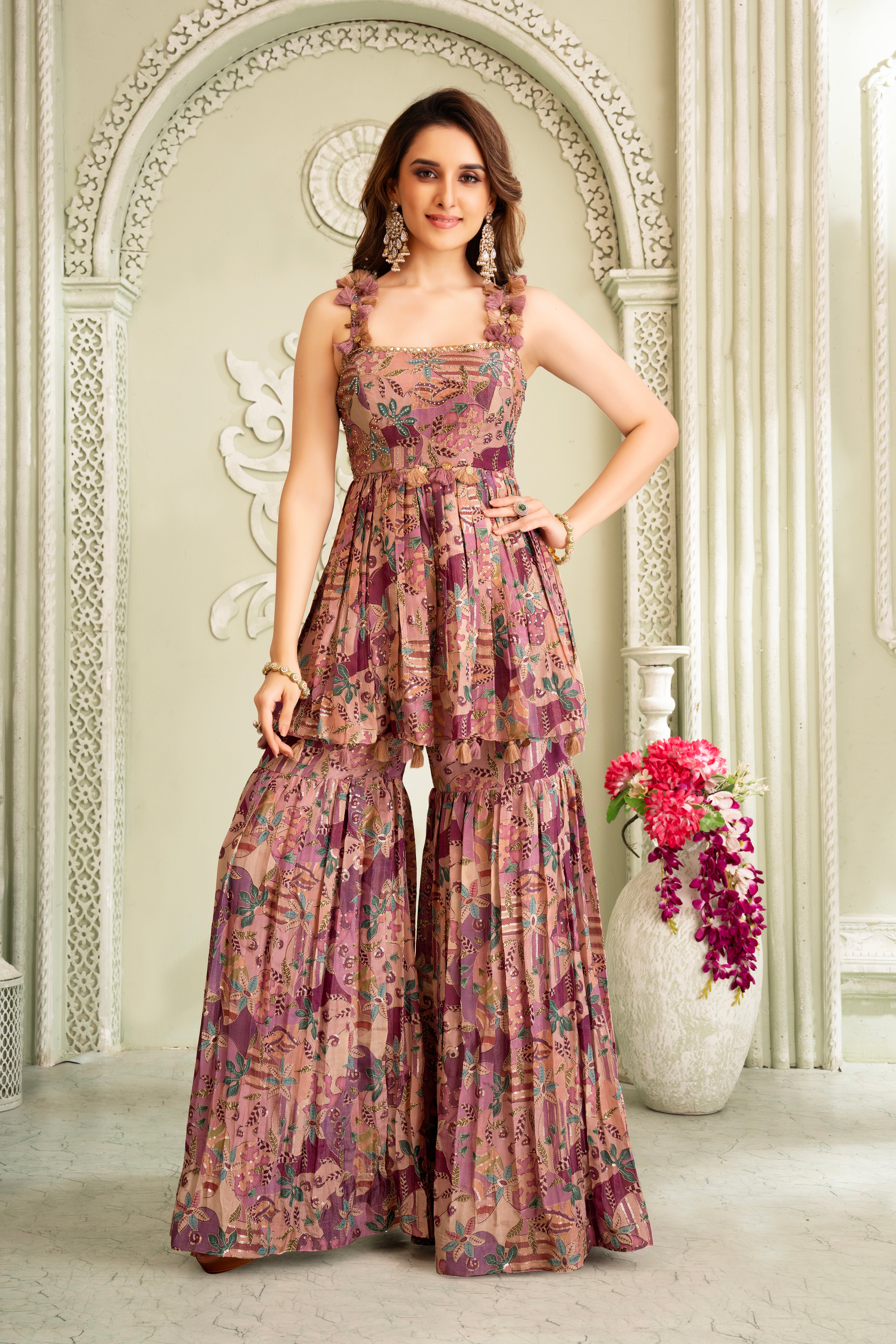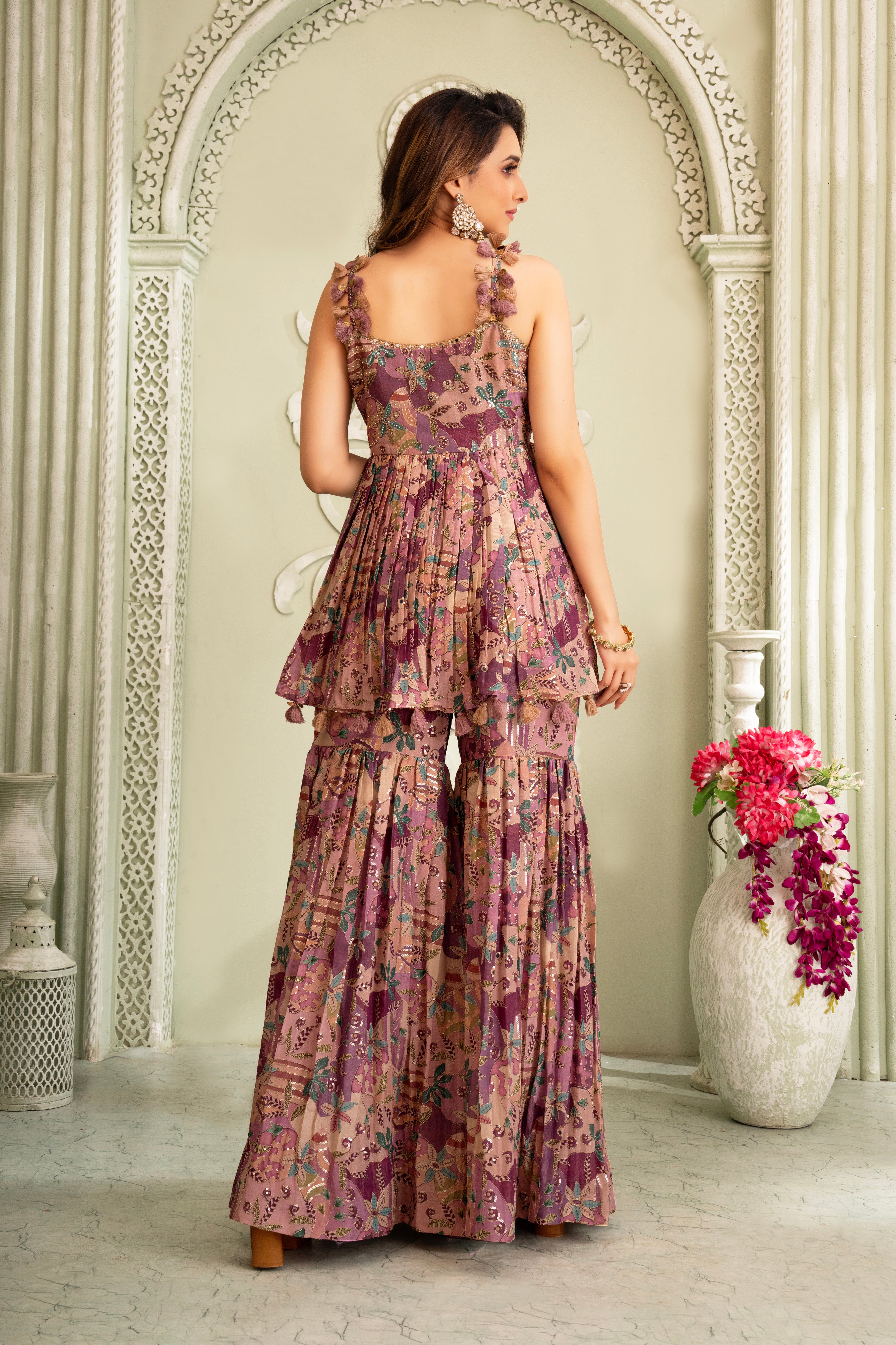 Elevate your festive collection with the Wine Floral Handwork Gharara Set, made from premium tissue silk. This peplum tunic with intricate sequin, tassels, and lace embellishments, beautifully merges traditional craftsmanship with modern design. Accompanied by coordinating gharara pants and a dupatta with an ornate border, this set is an ideal choice for sangeet, mehendi and other celebrations, promising a poised and elegant look.