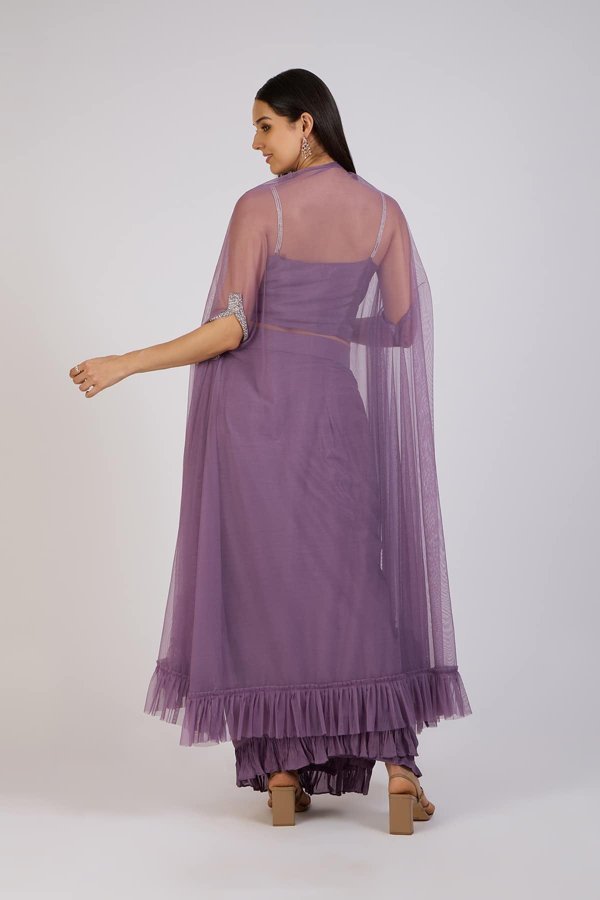 A stunning lavender draped set featuring a delicately embroidered blouse with floral accents.The ruffled draped skirt adds a playful touch, while the sheer cape with embellished borders completes the look.Designed for the woman who loves to make a statement while embracing comfort and style.
