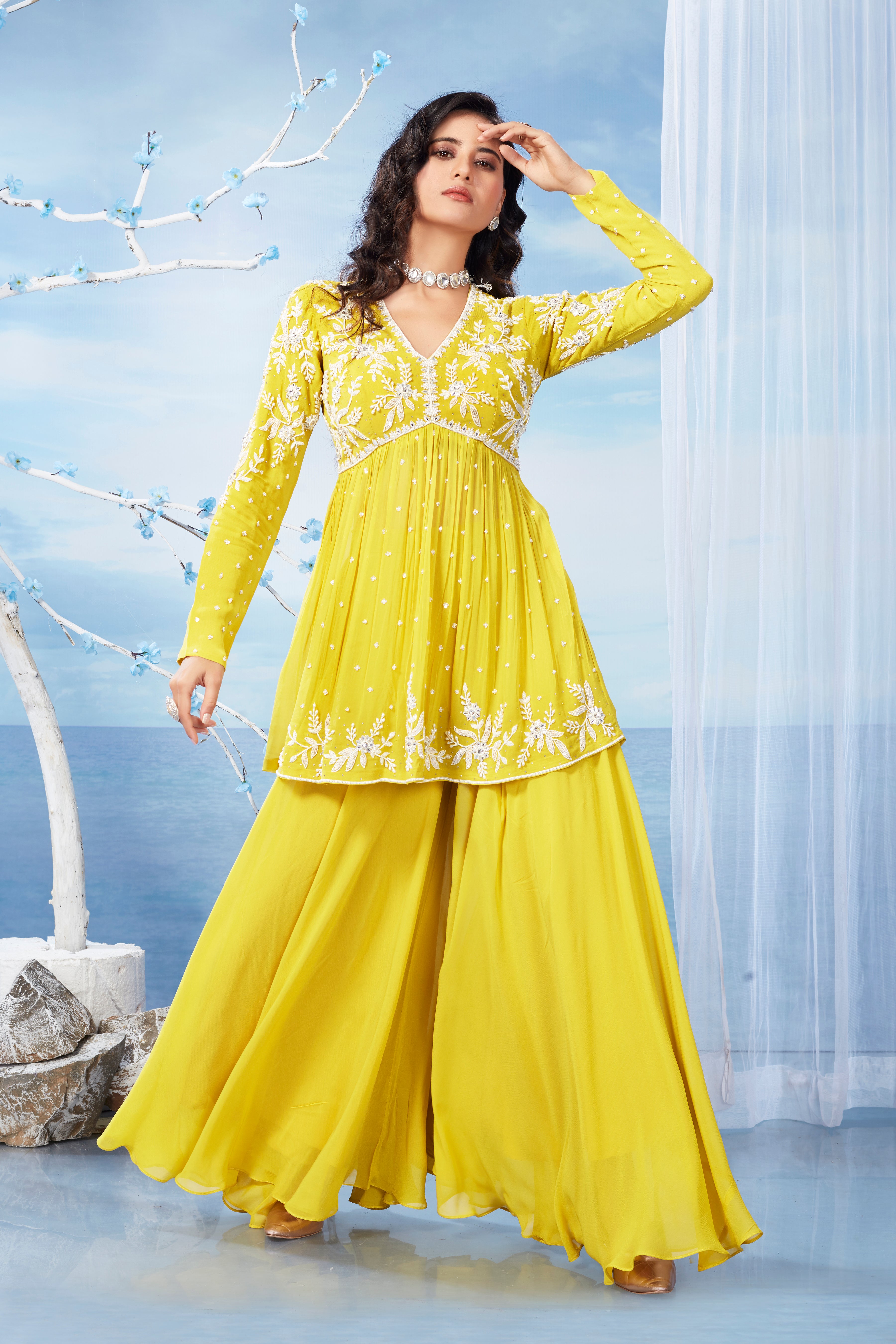 This mustard yellow peplum top is adorned with delicate hand-embellished pearls and mirror work, beautifully complemented by a concept sharara crafted from high-quality georgette fabric for a refined and elegant silhouette. The ensemble is completed with a flowing dupatta, offering a graceful and sophisticated look.