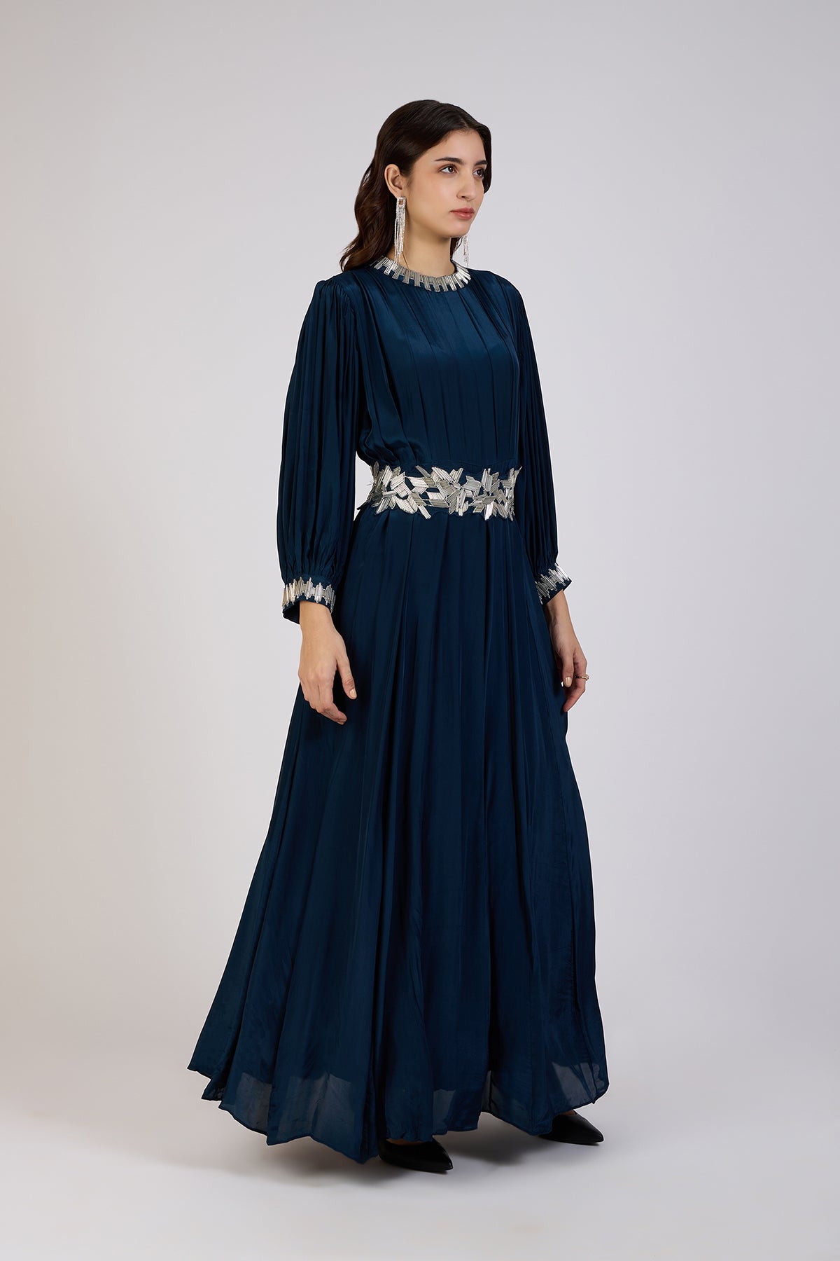 This pleated gown is crafted with delicate pleats for an elegant flow, it features a shimmering metallic belt with floral embroidery that accentuates the waist. The subtle embellishments on the neckline and cuffs add a touch of glamour, making it the perfect choice for evening soirées, formal occasions, or festive celebrations.