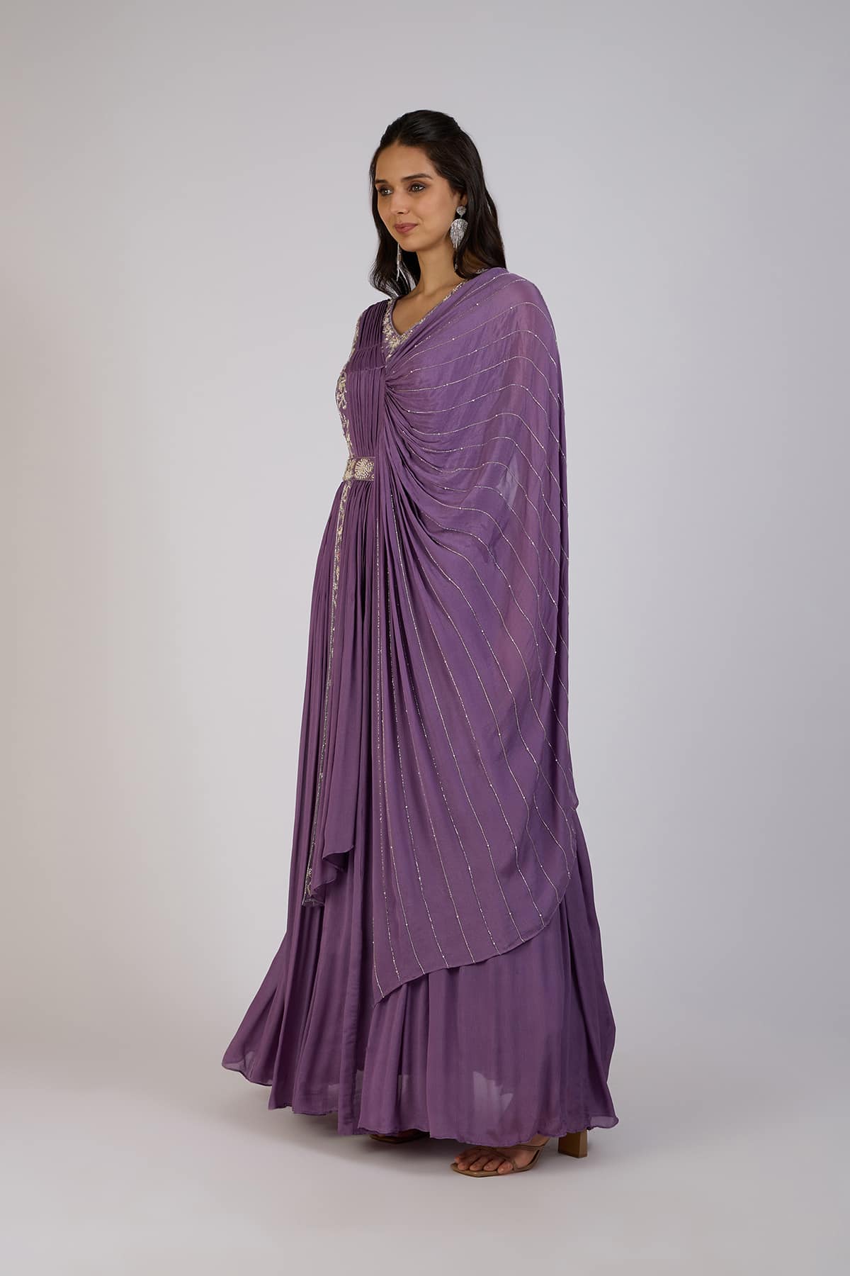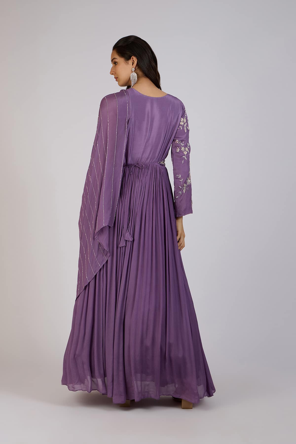 This stunning deep purple gown is a blend of timeless grace and modern sophistication. The floor-length, pleated gown features intricate silver floral embroidery that cascades down the bodice and sleeves, adding a regal touch. A delicately embroidered belt cinches the waist, enhancing the silhouette, while the attached draped with shimmering striped detailing lends an ethereal charm.