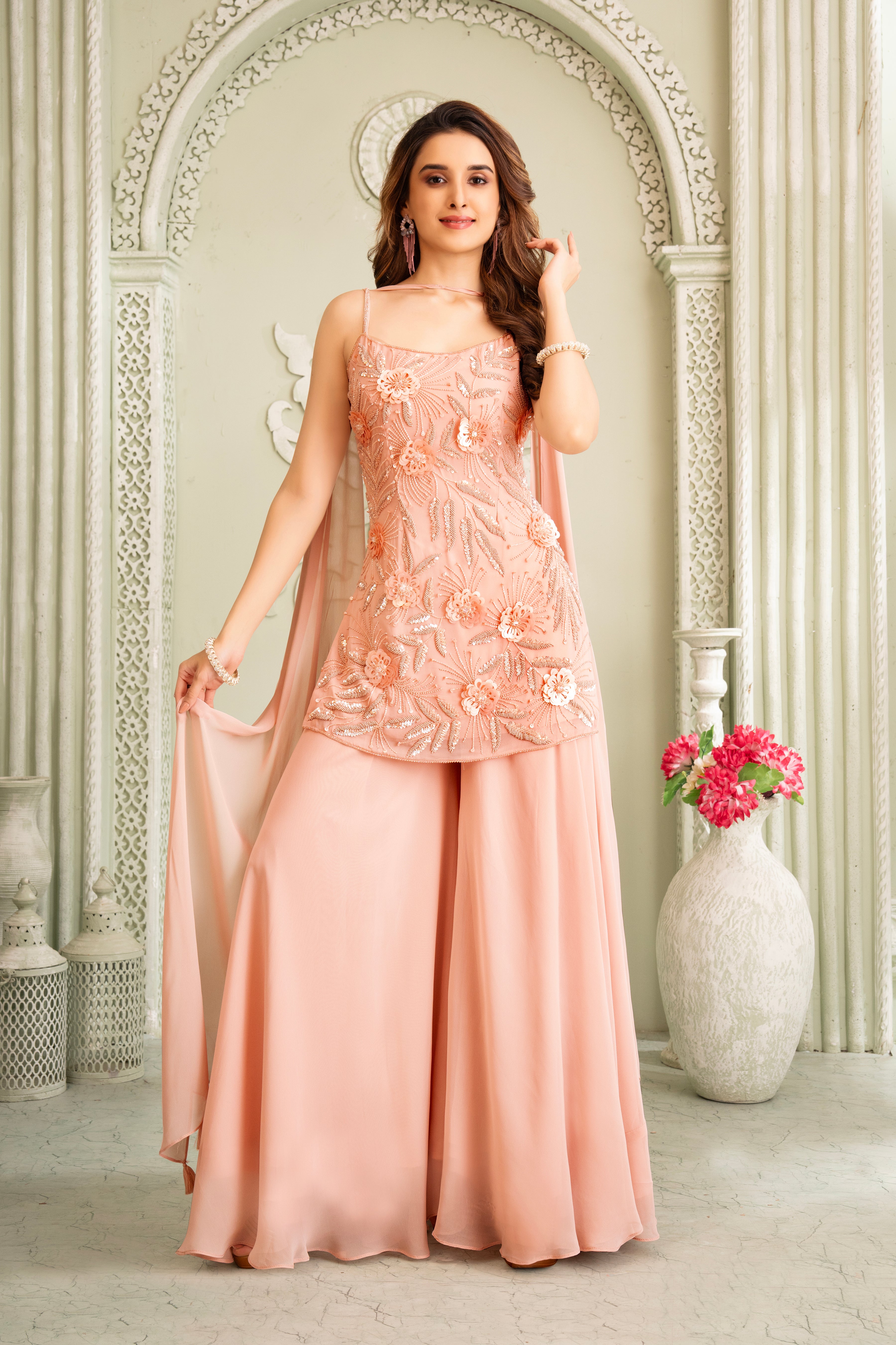 This peach spaghetti set features expertly hand crafted pearls, sequins and cut-dana arranged in an elegant floral design. Paired with a delicately crafted sharara made from lightweight georgette, it offers a poised and sophisticated silhouette. A flowing dupatta finishes the ensemble, exuding everlasting elegance and refined charm.