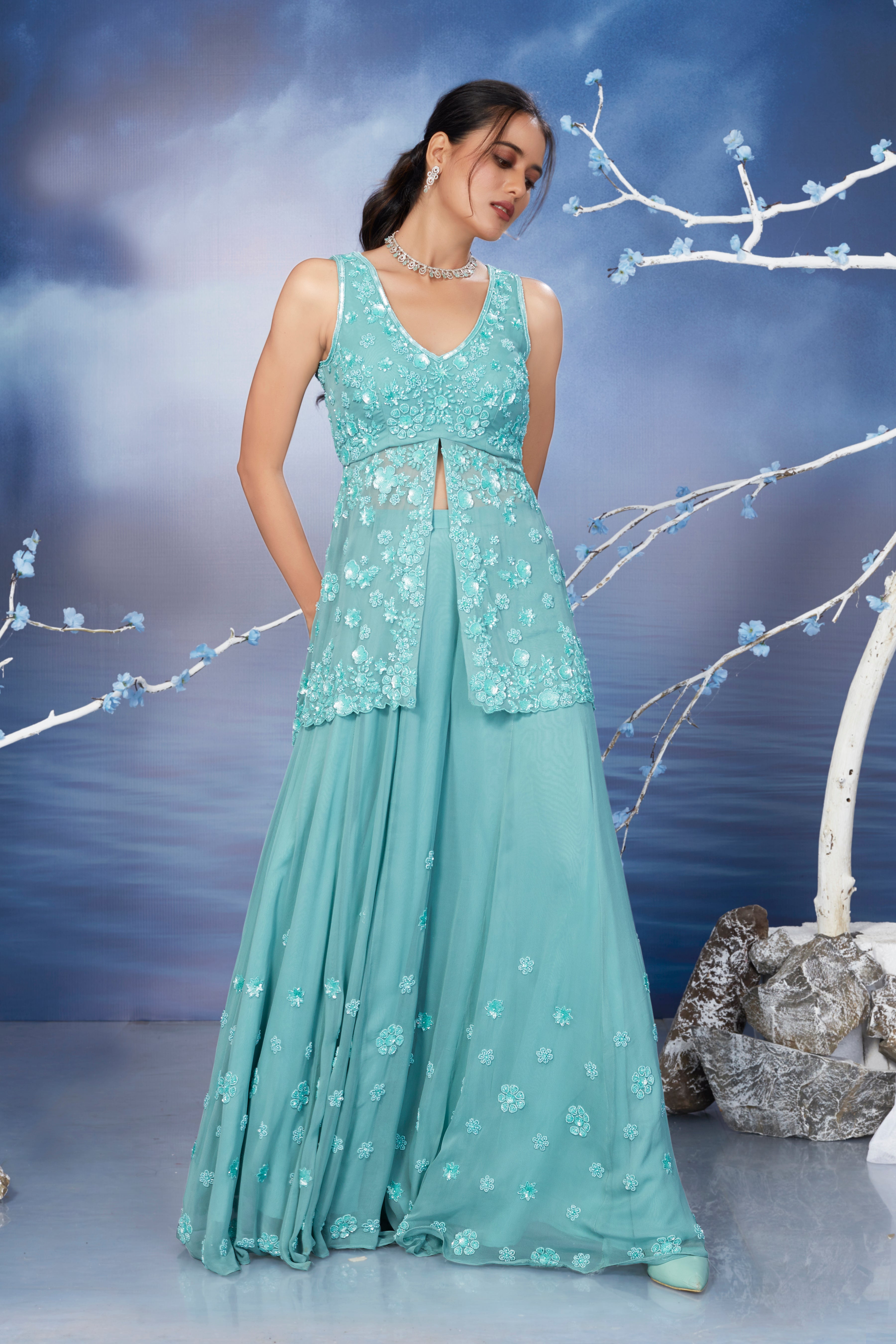 This sea green sleeveless peplum top with a front slit is adorned with meticulously hand-applied pearls, sequins, and cutdana arranged in an elegant floral pattern. It is paired with a concept sharara made from premium georgette fabric, featuring floral embellishments that enhance its refined silhouette. The ensemble is finished with a flowing dupatta, imparting an air of timeless sophistication and graceful allure.