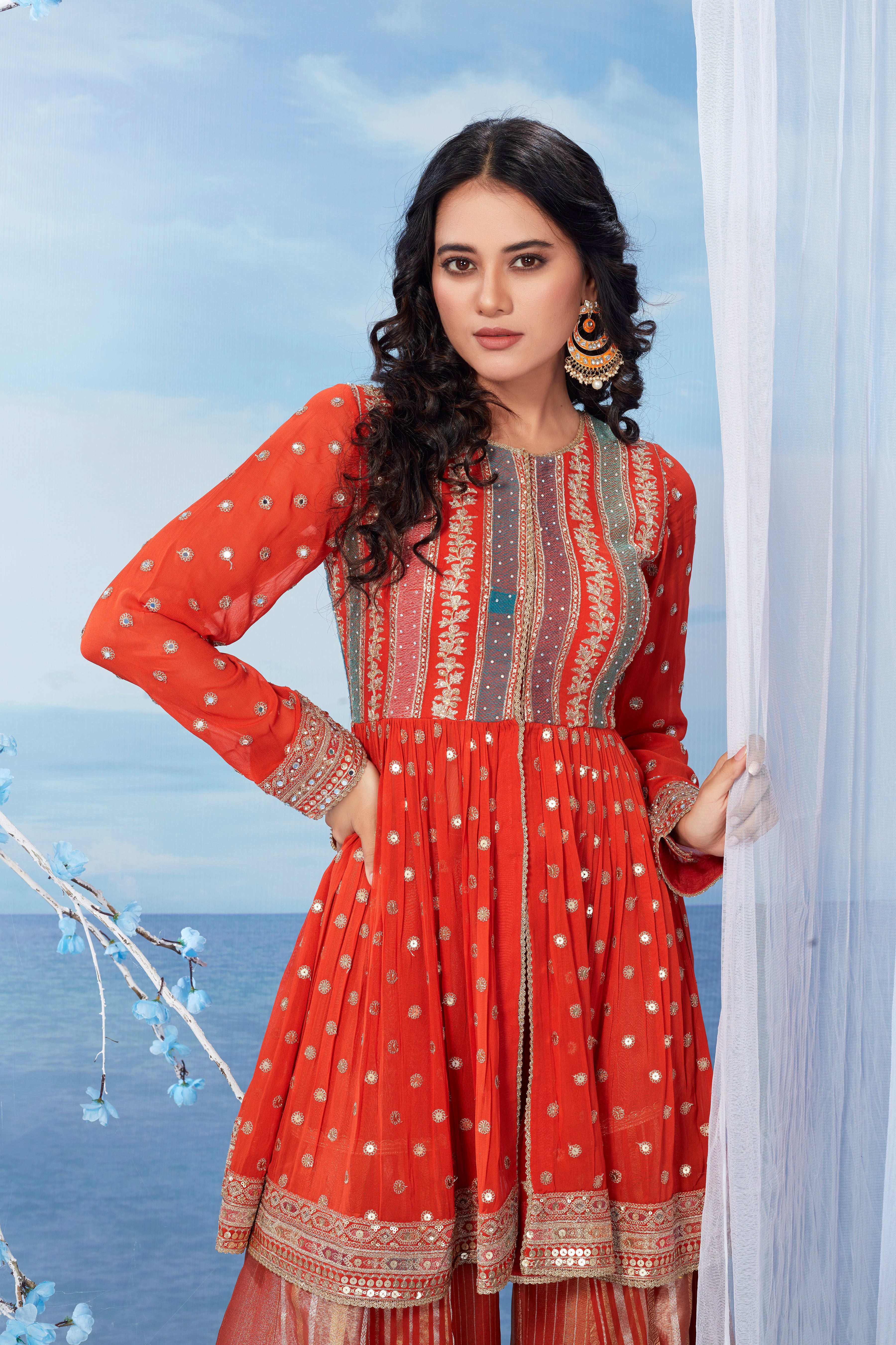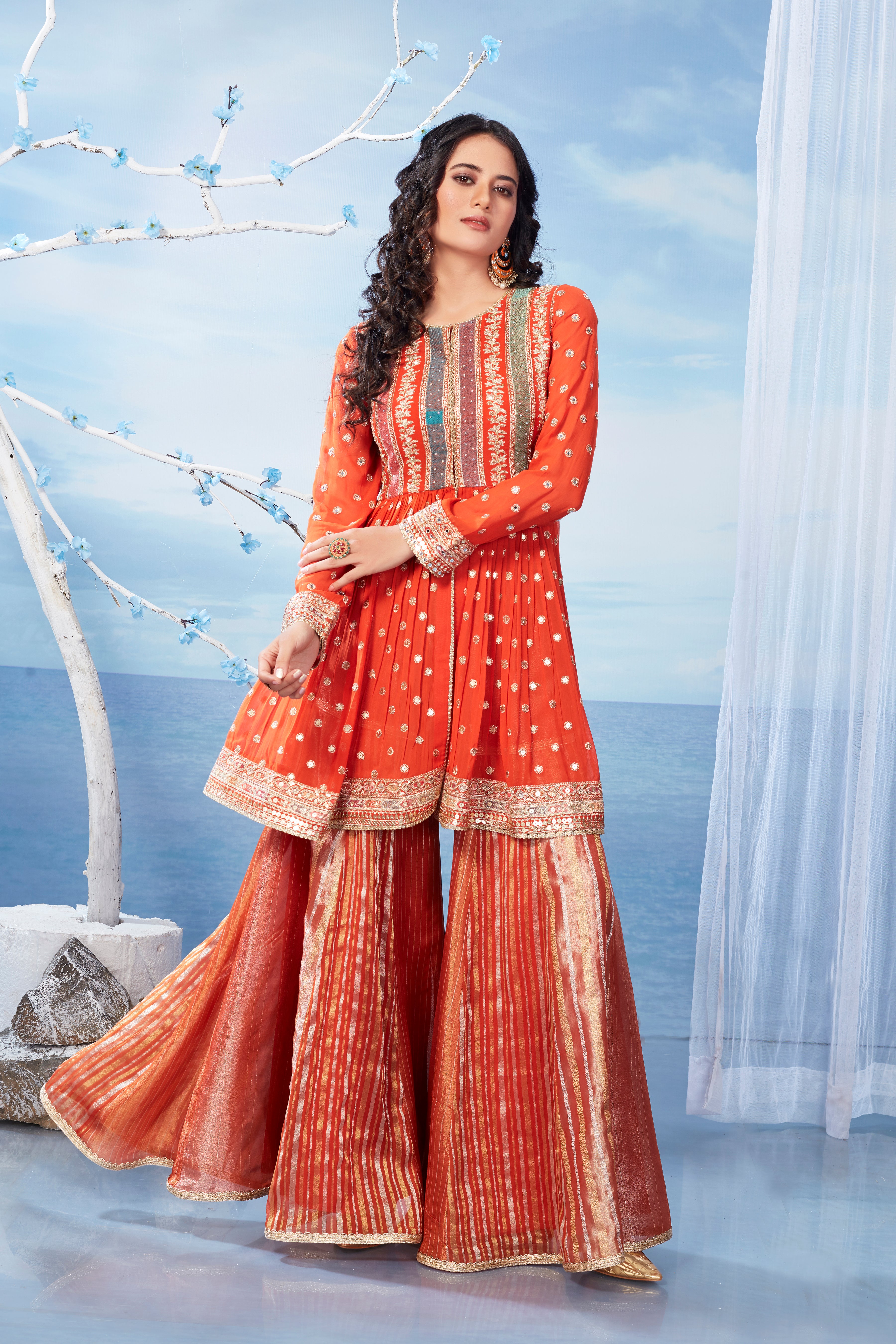 This exquisite ensemble showcases a hand-embroidered peplum kurta with a front opening, paired with beautifully crafted gharara pants. The delicately tailored dupatta completes the look, offering a graceful and opulent appearance.