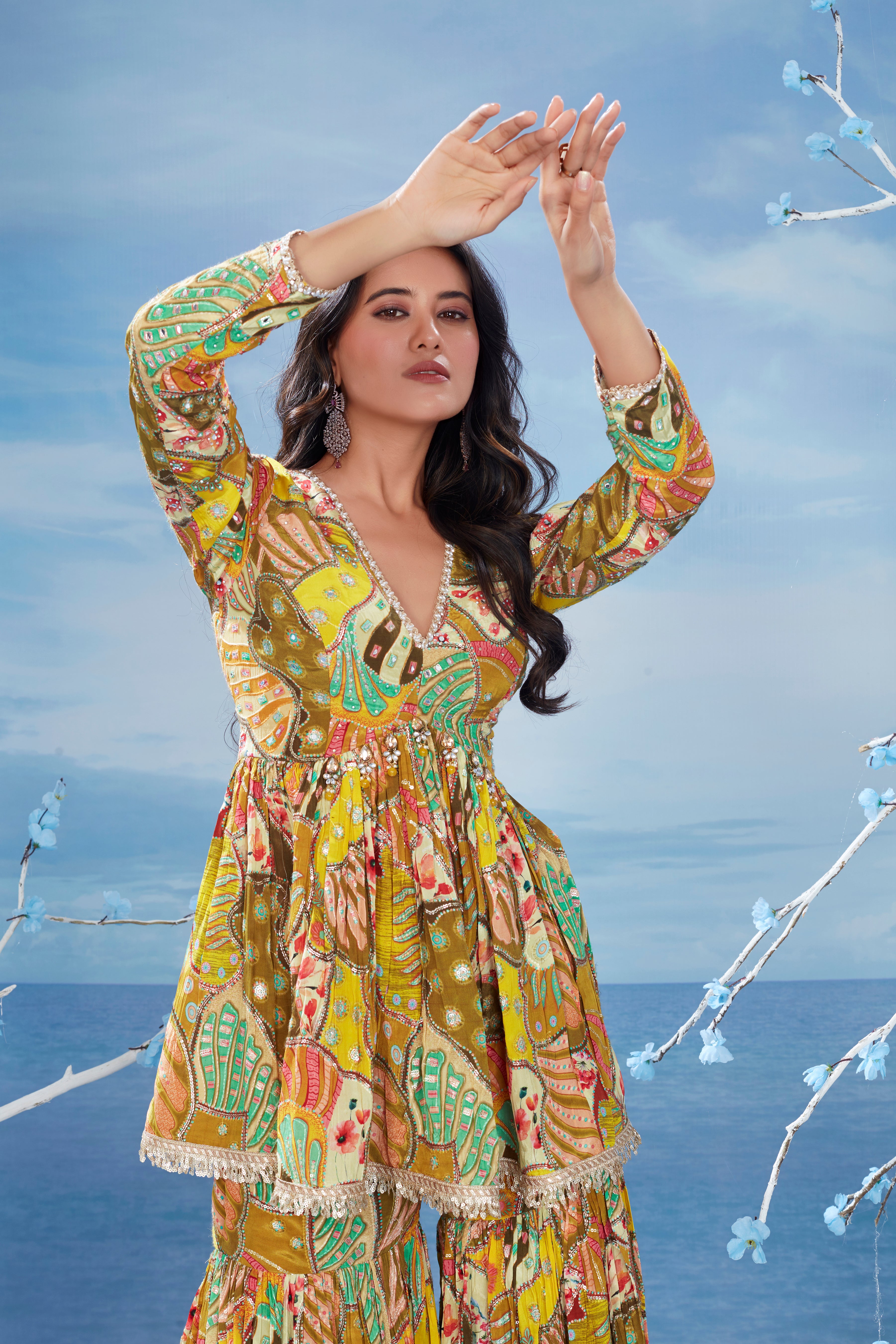 Refresh your wardrobe with this printed peplum top and gharara set, subtly enhanced with delicate embroidery. The ensemble stands out through its detailed craftsmanship and lace edging paired with striking prints. The elegant lace border finishes the look, ideal for semi-formal events that call for understated elegance and luxury.