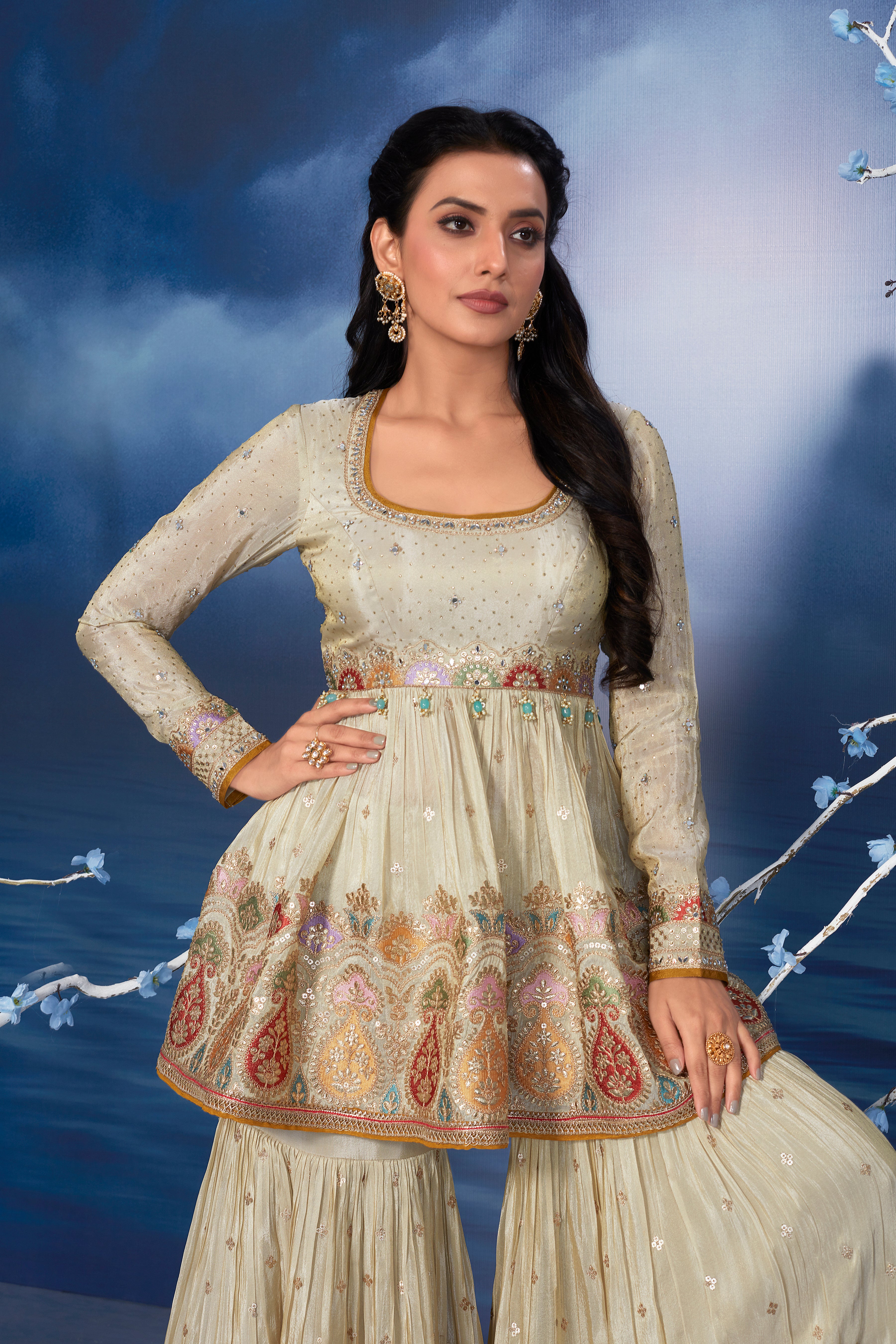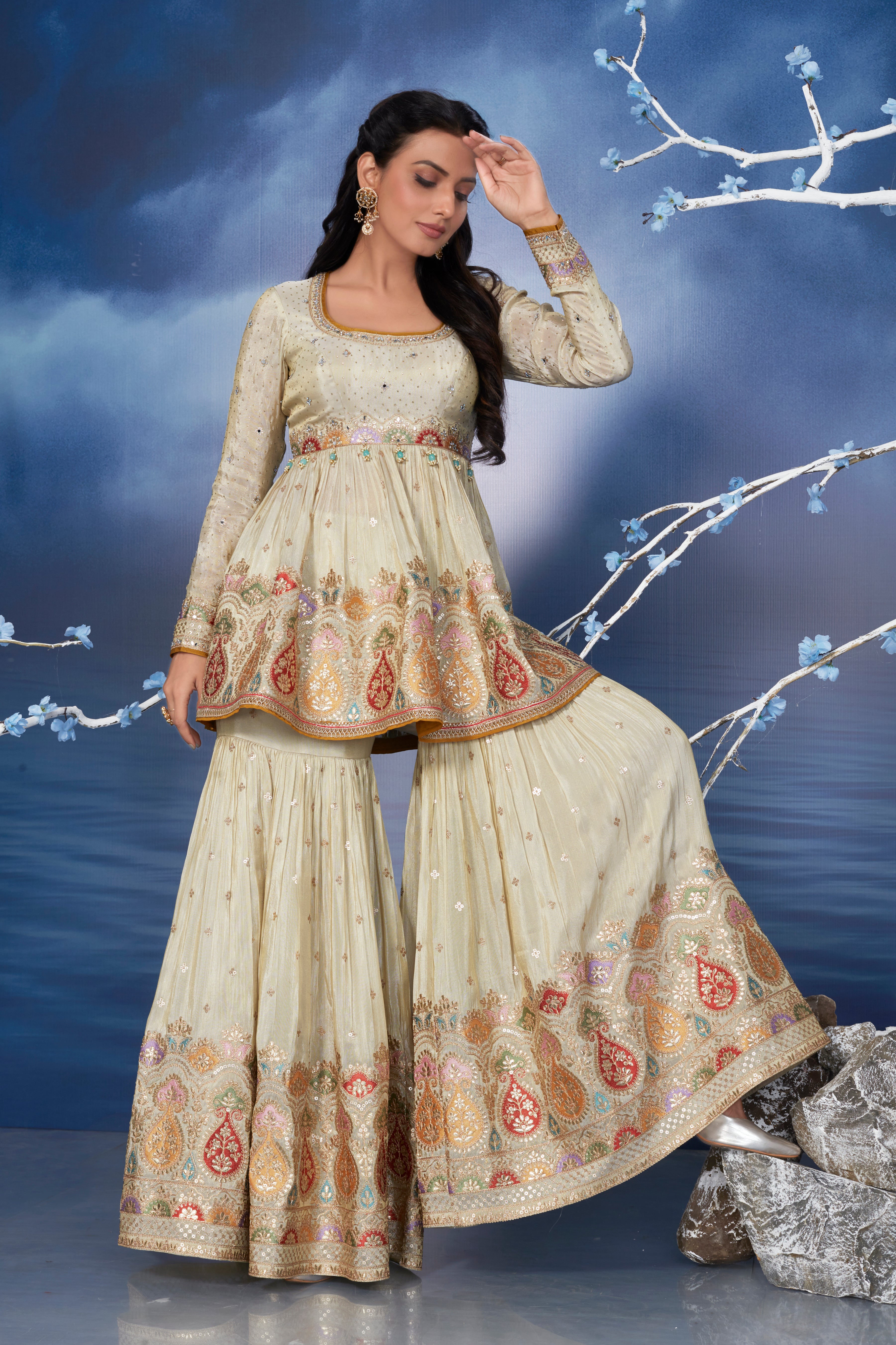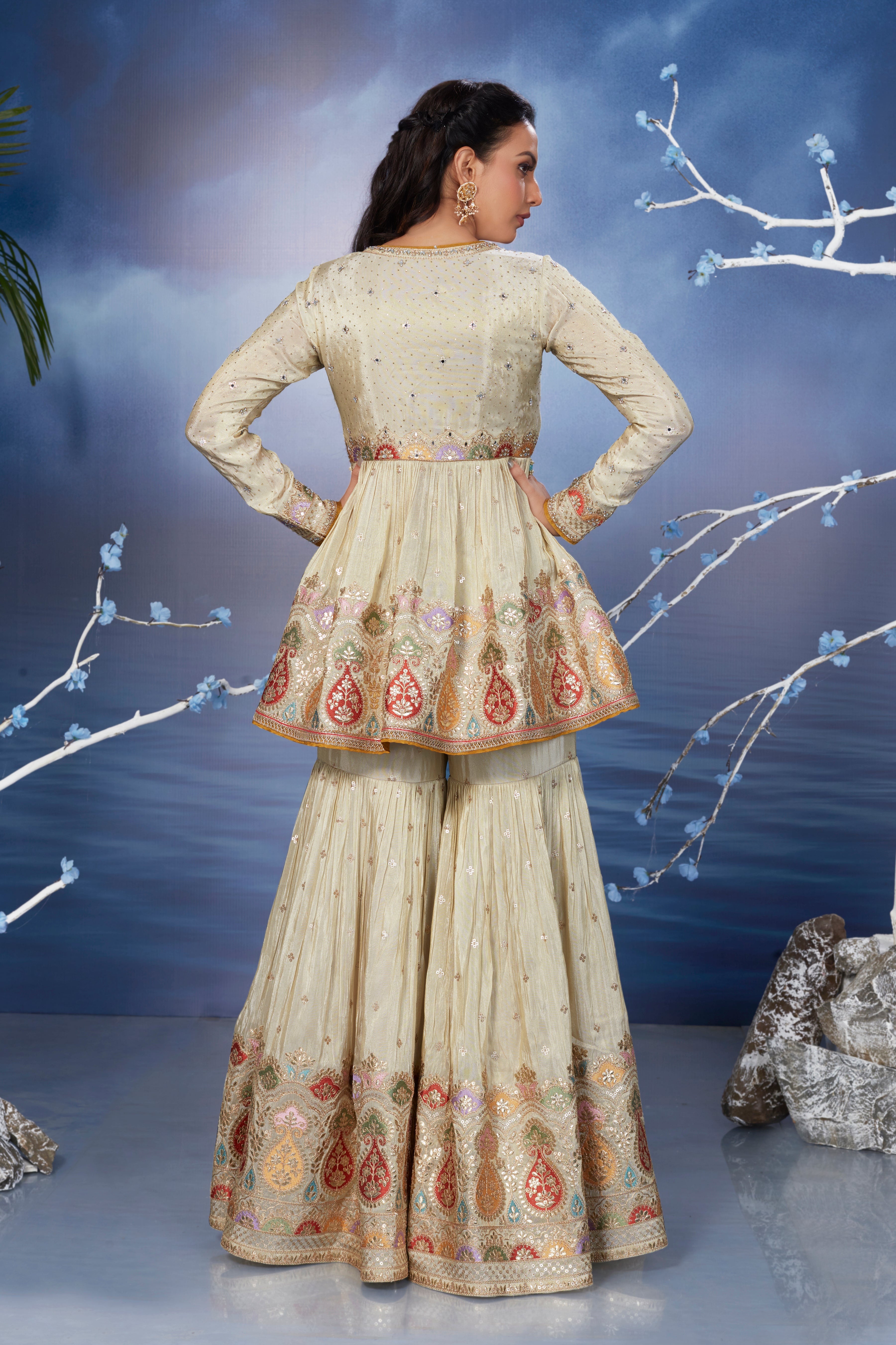Enhance your festive attire with the Champagne Gold Embellished Habutai Silk Gharara Set. This stunning outfit includes a padded peplum tunic lavishly decorated with sequins, beads, mirrors, and gottapatti, reflecting exquisite artistry. It is complemented by coordinating embellished flared gharara pants and a matching dupatta. Ideal for semi-formal events, this set embodies elegance and sophistication.