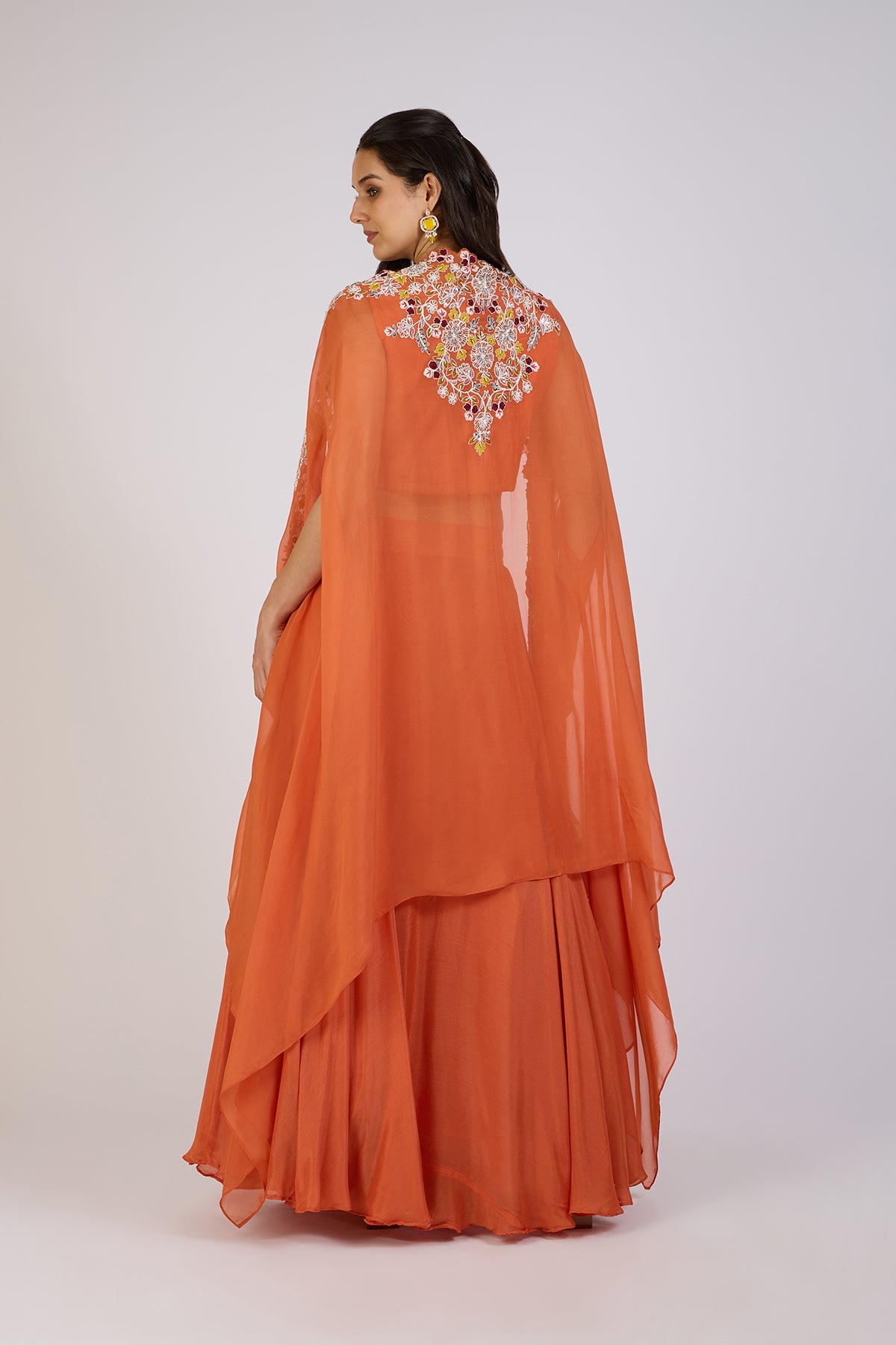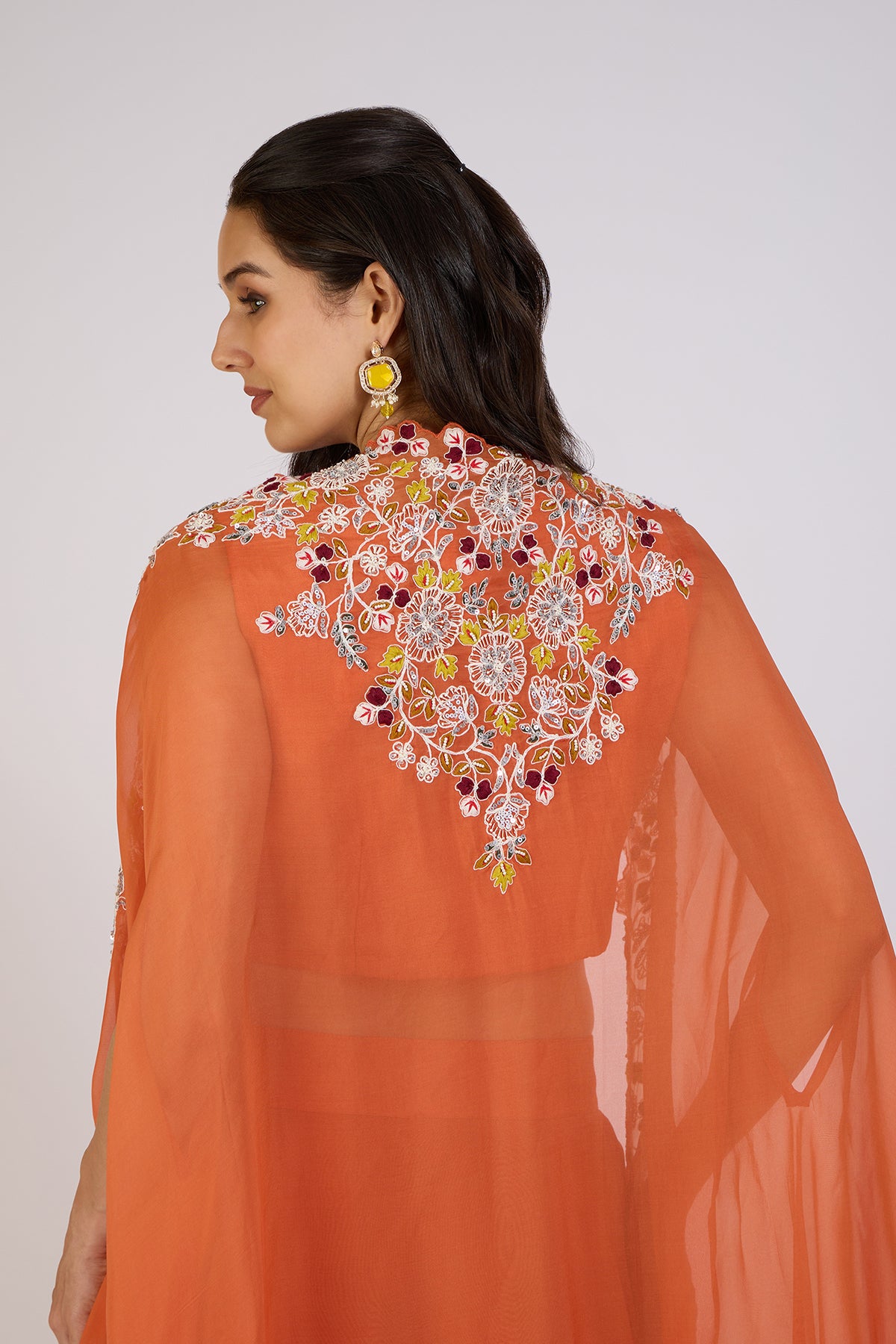 This elegant terracotta cape lehenga set features intricate floral embroidery in white, yellow, and pink, adding a pop of color to its warm hue. The cropped blouse with delicate detailing pairs beautifully with the flowing, floor-length skirt for a flattering silhouette. The sheer, embroidered cape drapes effortlessly, offering a modern twist to a classic look. Ideal for weddings, festive celebrations, or special occasions, this ensemble blends timeless grace with contemporary flair.